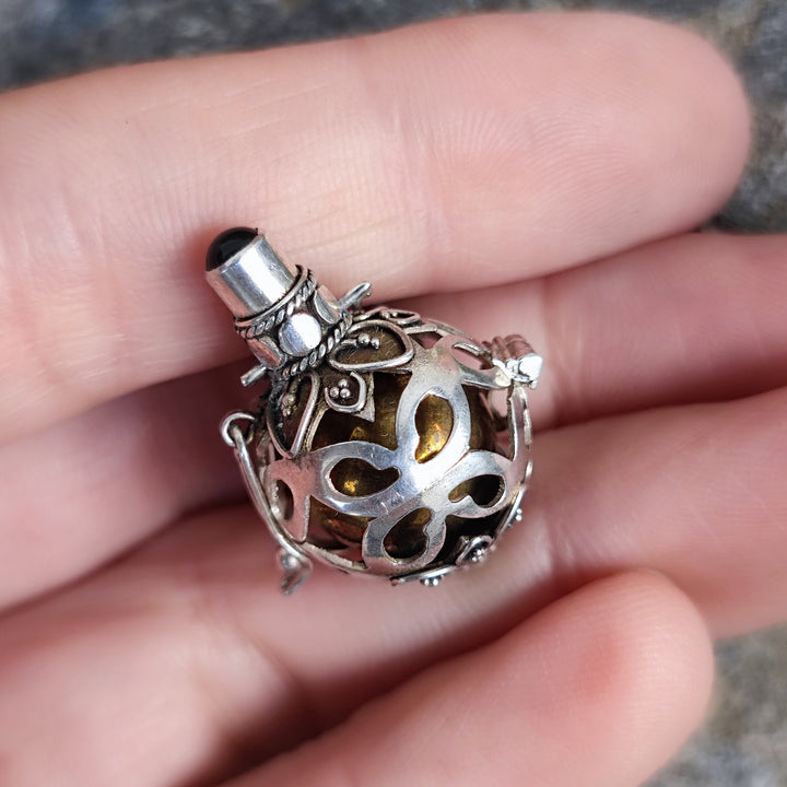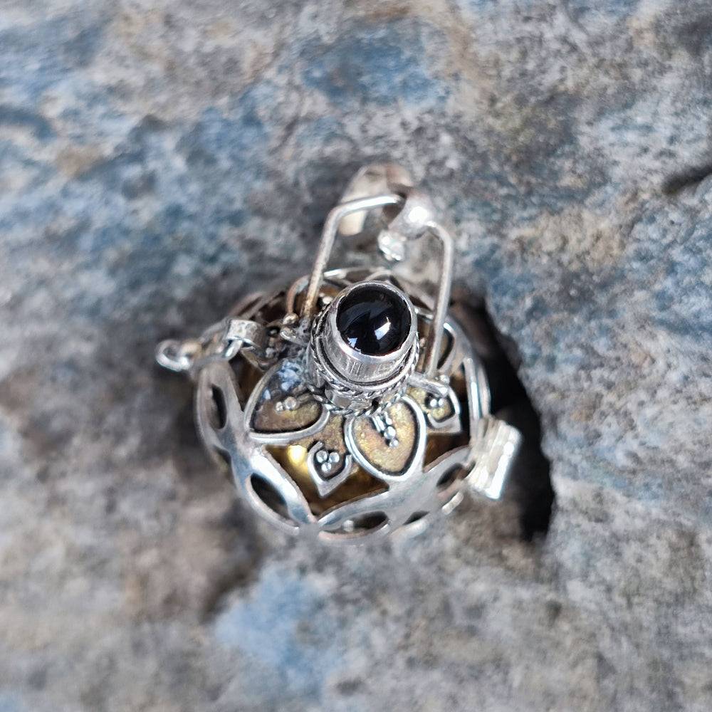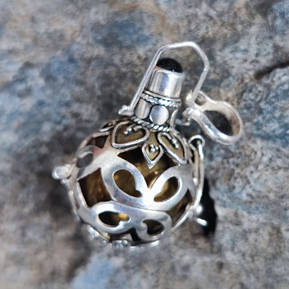Ciondolo Chiama angeli in argento 925 con pietra - GABRIELE. Ciondolo in argento 925 con pietra a scelta: turchese, onice nero, quarzo fumé e Granato. Il ciondolo ha una forma unica e originale: ha una parte esterna in argento lavorata e su cui è incastonata una piccola pietra. All'interno ha una sfera in ottone con un piccolo sonaglino all'interno che produce il suono tipico del chiama angeli.