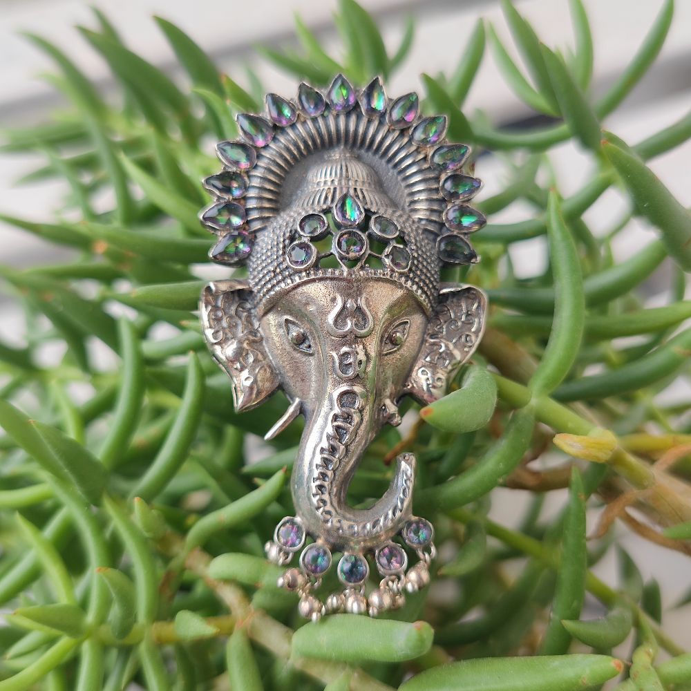Ciondolo in argento 925 elefante con pietra - HARITARI. Un ciondolo realizzato a forma di testa di elefante con una superficie parzialmente brunita. Il ciondolo è impreziosito con elementi decorativi tipici della gioielleria tradizionale indiana e pietre di topazio mistico oppure granato.
