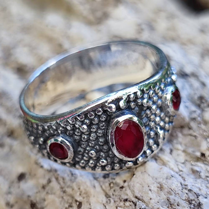 Oltre a questo la superficie dell'anello è parzialmente brunita e il design etnico con pietra cabouchon. L'anello a fascia è inoltre realizzato in argento 925 anallergico. La sua superficie infatti non è trattata né placcata quindi garantisce la sua bellezza col passare degli anni.