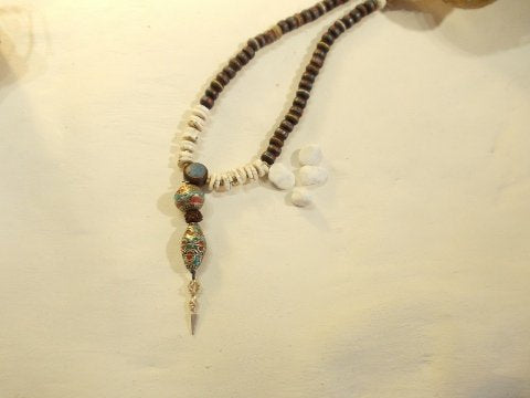 Japa mala con numerazione dei zen mala. Il mala e composto di 108 beads in osso e Lapislazzuli. Il teschio e di magnesite. I guru beads sono elementi tibetani realizzati interamente a mano e ottone con schegge di corallo e turchese.