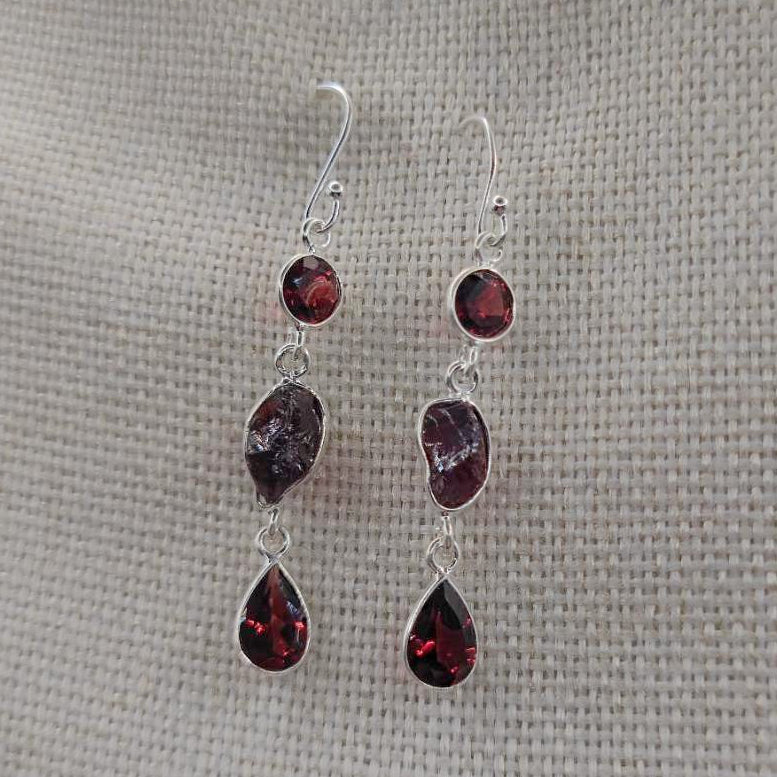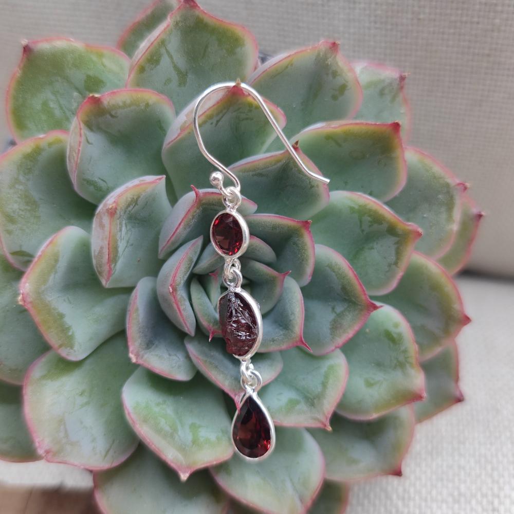 Orecchini pendenti argento 925 con granato - ASHA. Lasciati conquistare dagli orecchini pendenti in argento 925 con granato, un gioiello luminoso e intenso che unisce eleganza e carattere. Il design a tre pietre crea movimento e profondità: in alto una gemma sfaccettata che cattura la luce, al centro un granato grezzo dalla texture naturale, in basso una goccia sfaccettata dal rosso vino.
