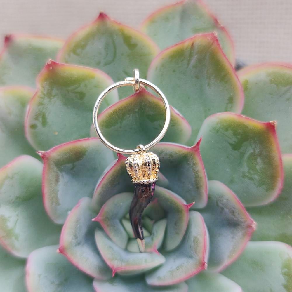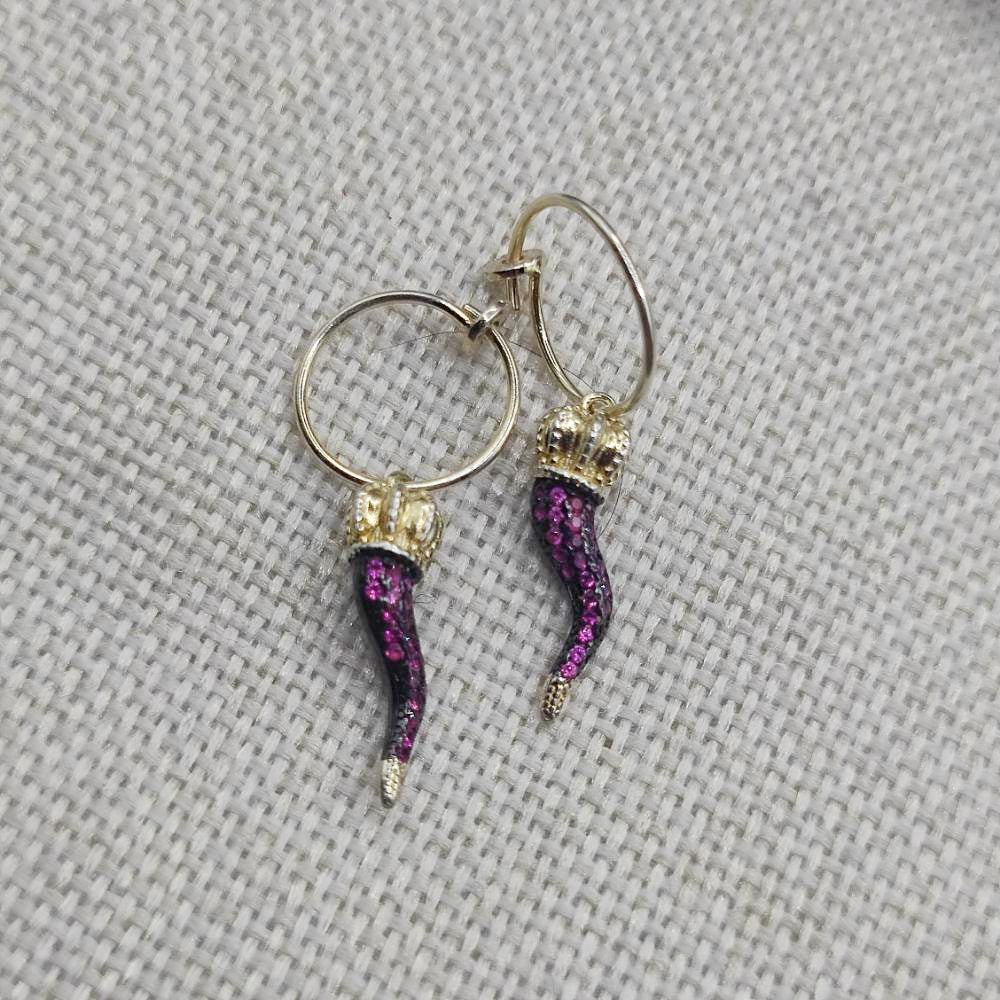 Orecchini artigianali in argento dorato con zirconi - KARMA. Orecchini etnici in argento dorato con cornetto portafortuna e zirconi colorati, un gioiello simbolico che unisce tradizione mediterranea e spirito contemporaneo. Il corno, da sempre emblema di protezione, forza e buon auspicio, viene reinterpretato in chiave elegante grazie alla finitura dorata e alla brillantezza degli zirconi viola, che catturano la luce con discrezione.