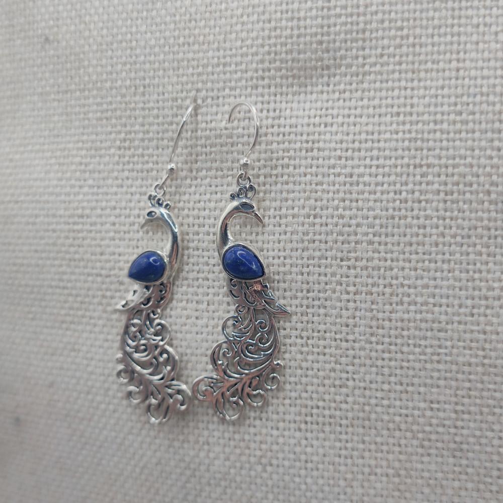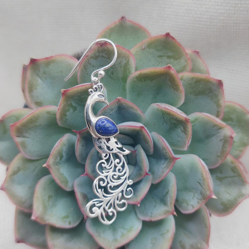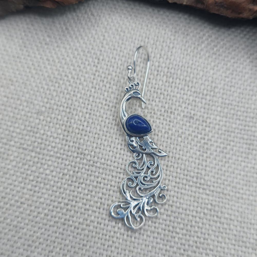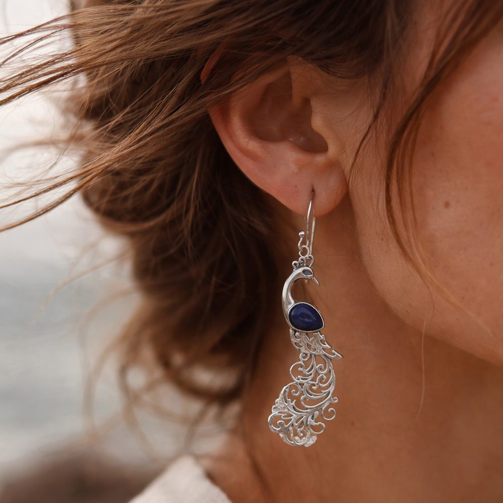 Orecchini con pavone in argento 925 lapislazzuli - NEERJA. Leggeri, eleganti e pieni di significato: questi orecchini a forma di pavone uniscono la luminosità dell’argento 925 alla profondità del lapislazzuli, con il suo blu vellutato e venature naturali.