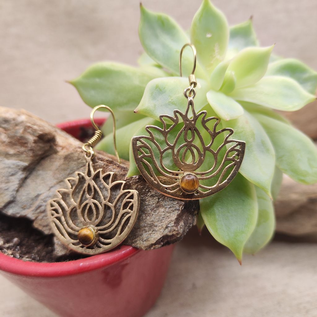 Orecchini etnici PADME in ottone color oro che raffigurano il fiore di loto, arricchiti da una pietra taglio rotondo.