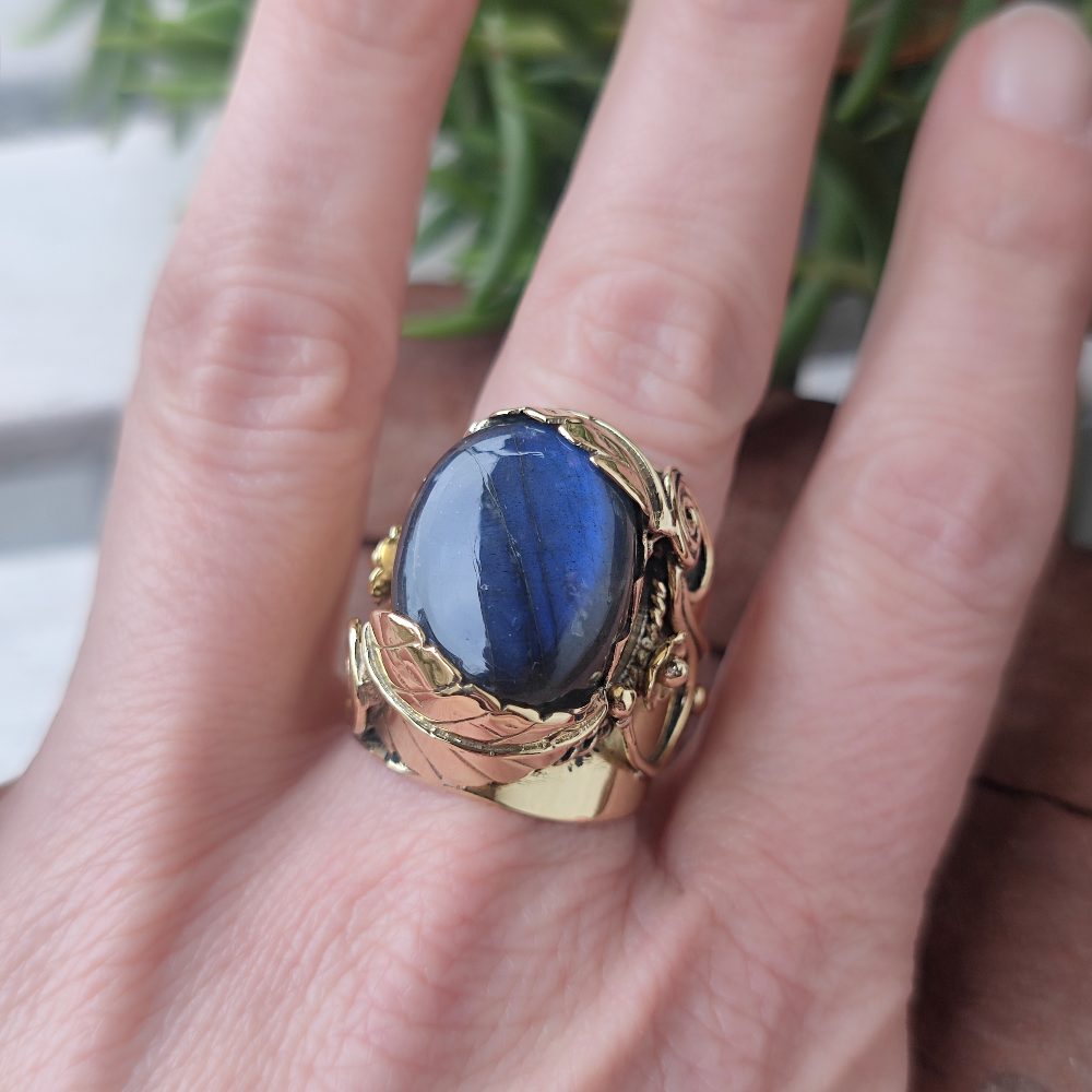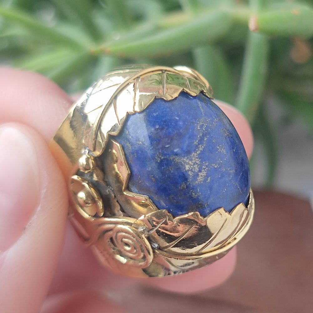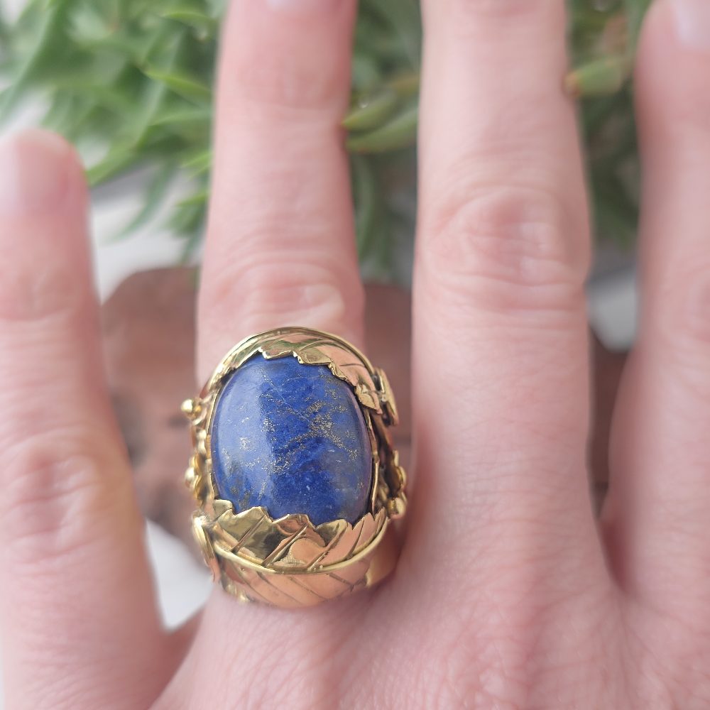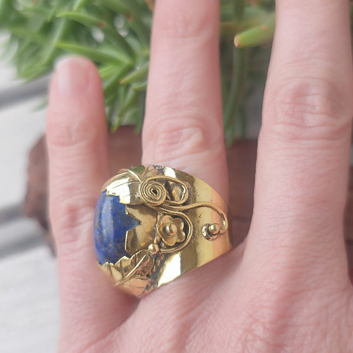 Entdecken Sie den Charme und die Eleganz unseres Natursteinrings. Jeder Ring ist ein Unikat, da es sich um Natursteine ​​handelt und das Aussehen leicht variieren kann. Ein leuchtender und origineller Ring, ideal für jeden Look. Wählen Sie Ihren Ring mit einem Labradorit- oder Lapislazuli -Stein, der in ein hohes Band eingefasst und fein mit Blumenmotiven verziert ist.