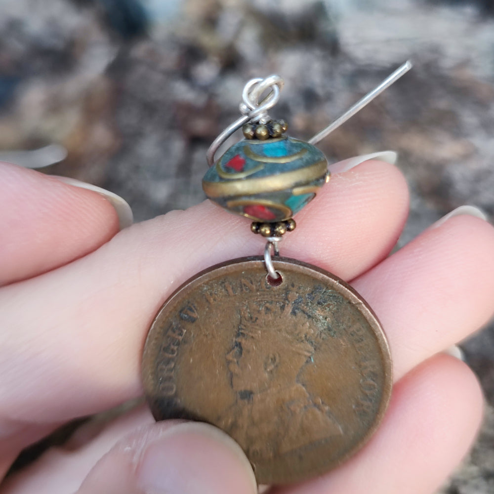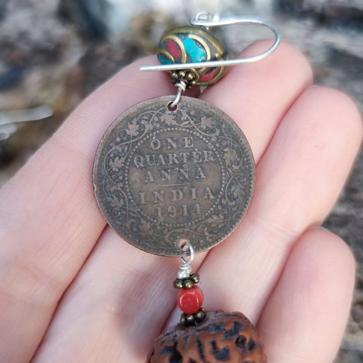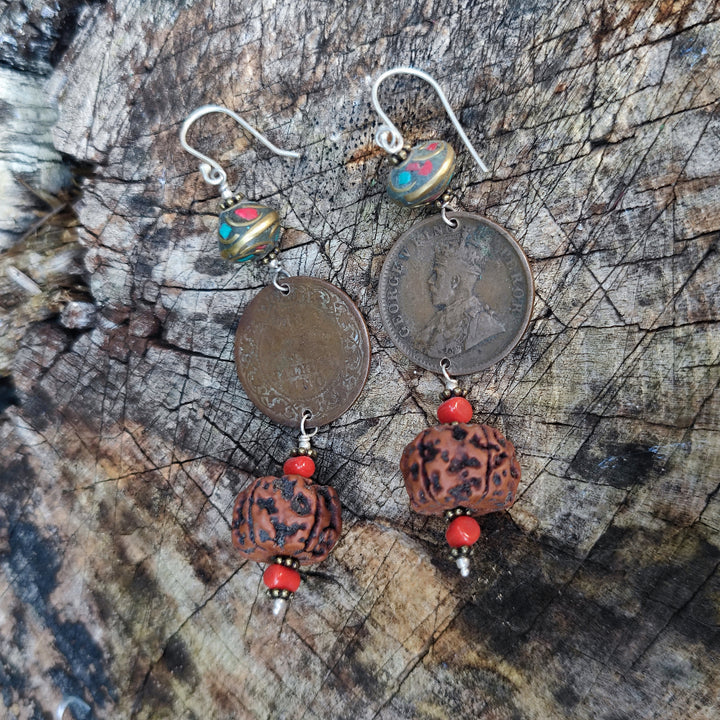Silberne OHRRINGE mit antiken Münzen - SADAR. Indische ethnische Anhängerohrringe aus Silber mit antiken Münzen, die König Georg V. aus dem Jahr 1914 darstellen, verziert mit Korallensteinen. Die Ohrringe werden von Hand zusammengesetzt, indem Elemente aus Bronze und Messing ausgewählt werden, während die Haken und Befestigungsteile aus Silber sind. Die Ohrringe sind mit Korallen und einer fünfseitigen Rudraksha verziert.