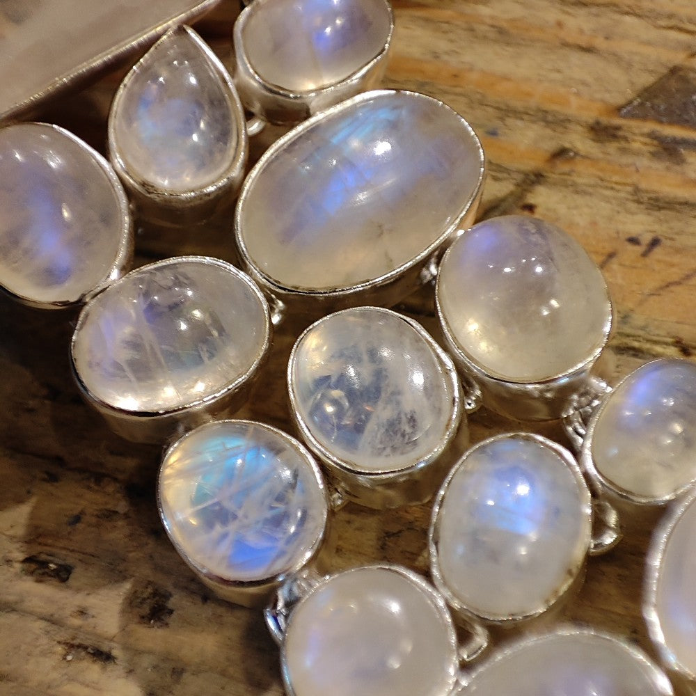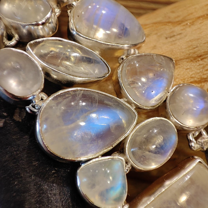Dieses vollständig von Hand gefertigte Armband weist eine Struktur auf 925er Silber welches perfekt am Handgelenk sitzt. Das Armband ist außerdem mit einer Reihe prächtiger Mondsteine verziert, die mit Fantasie und Bewegung besetzt sind.