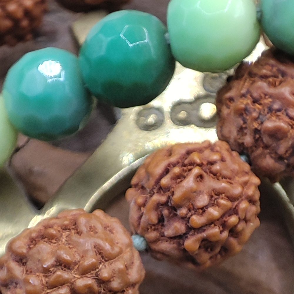 • Materialien: Messing, natürlicher Chrysopras, Rudraksha-Samen