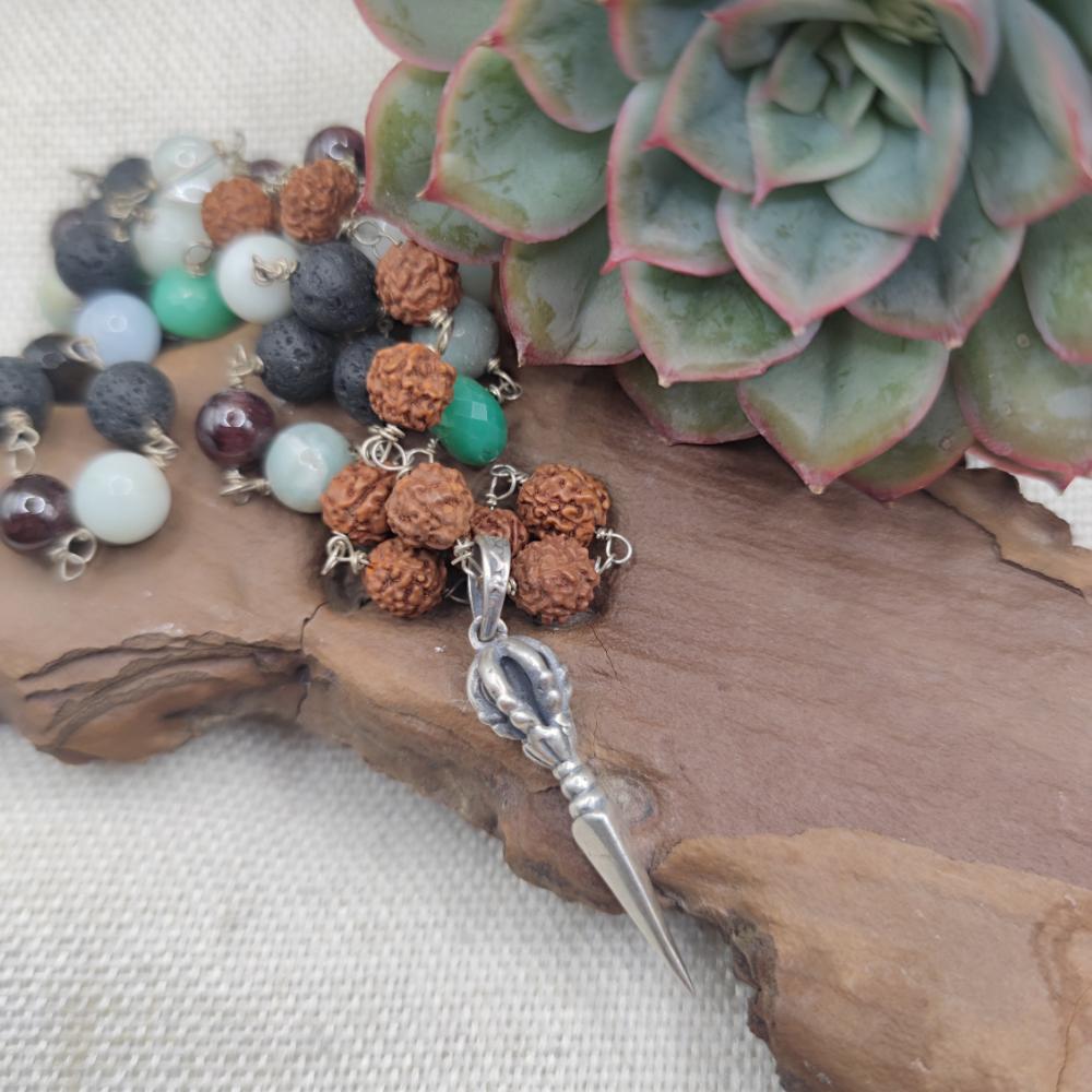 Im Zentrum steht der Protagonist: der tibetische Dorje (Vajra), ein Symbol der buddhistischen Tradition. Er verkörpert innere Stärke und geistige Klarheit, einen spirituellen „Blitz“, der Entschlossenheit und Mitgefühl vereint. Ihn zu tragen ist wie ein kleiner Talisman: dezent und doch voller Präsenz.