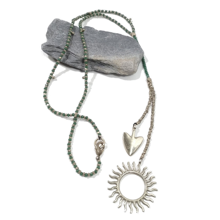 The necklace is made up of 3mm solid brass faceted cubes knotted one by one. Depicted are the SUN and an ARROW tip