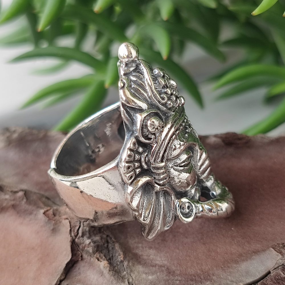 925 silver ring with GANESH - DUDRA. Ethnic ring in 925 silver. Its surface is polished and depicts the head of God Ganesh. The ring is open and slightly adjustable.