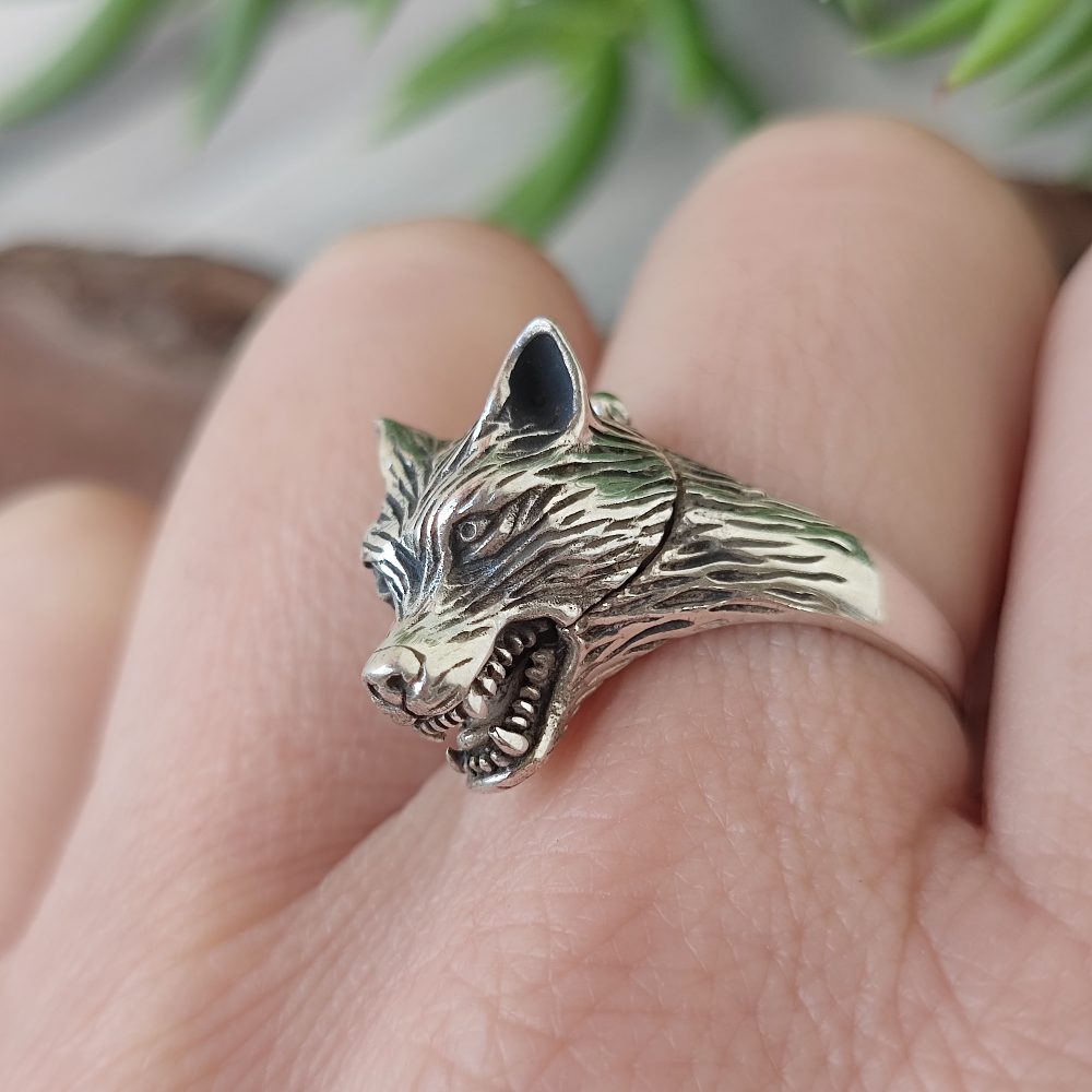 Express your inner strength with our silver wolf head ring, a unique piece of jewelry with an aggressive and detailed design. Crafted in 925 silver, this ring accurately depicts the head of a snarling wolf, a symbol of courage, loyalty and wild instinct. Perfect for people with a free spirit, this ring is ideal for those who love to stand out with a bold and charismatic style.