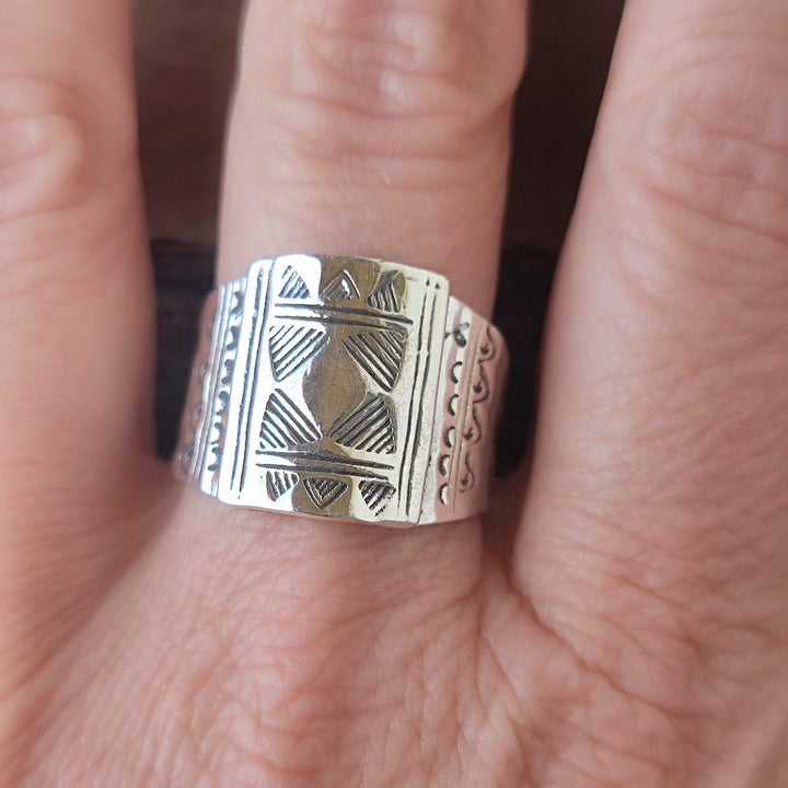 Crafted in solid silver, each piece is unique thanks to the craftsmanship, which highlights its irregularities and authenticity. The ring stands out for its bold yet balanced design, perfect for those who love ethnic, boho or tribal style accessories.
