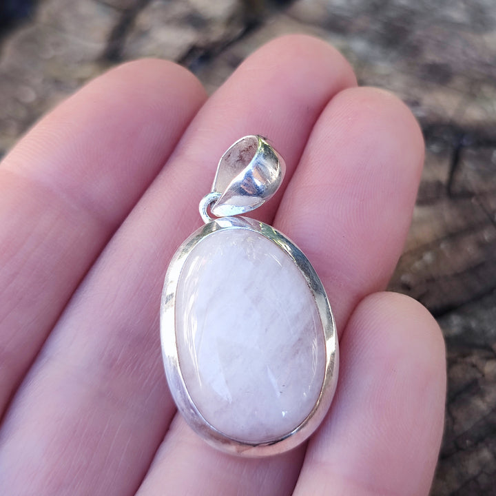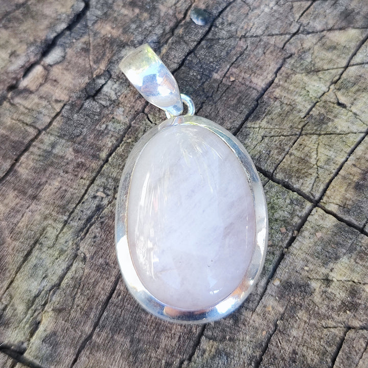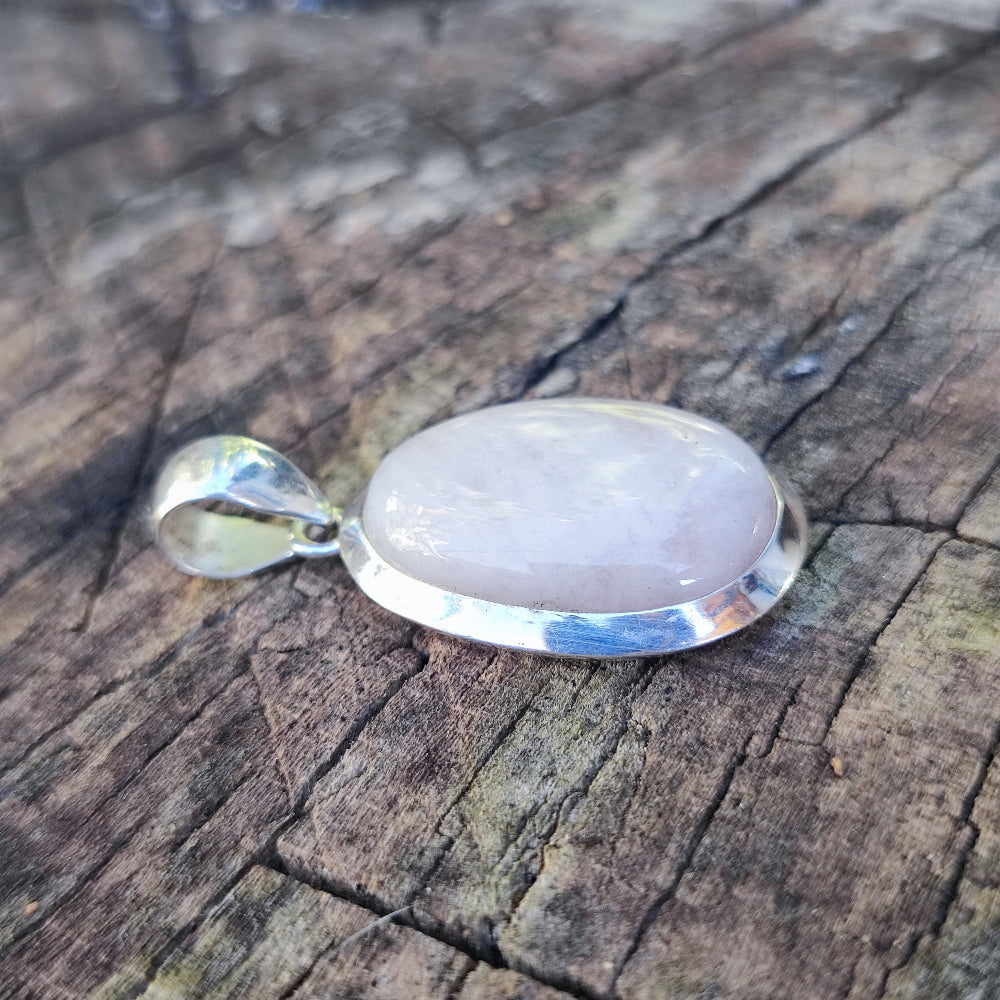 Ethnic pendant in 925 silver with stone - ARVI. Its surface is polished, the shape is oval and the stone set is a Morganite .