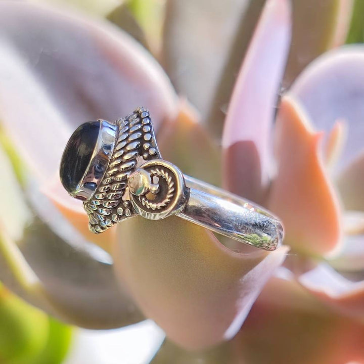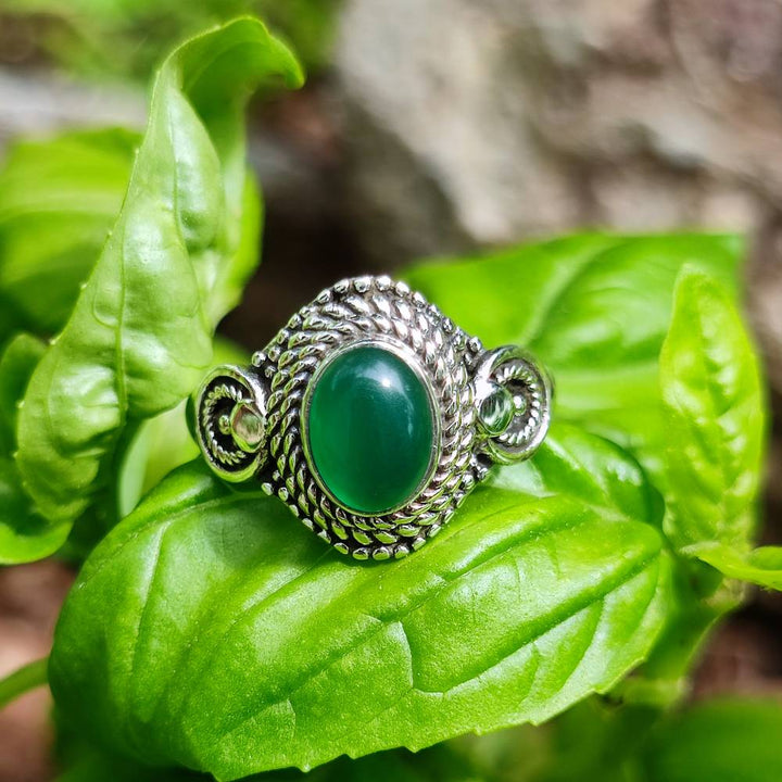 KAMBOJ 925 silver stone ring. This type of craftsmanship is typical of North Indian jewelry. In fact, as ornamental elements, made one by one by hand, not only dots, filigree, petals, floral motifs are used, but also the depictions of peacocks, elephants, tigers and snakes which are an integral part of Indian ethnic jewellery. The ring is also handcrafted in 925 silver .