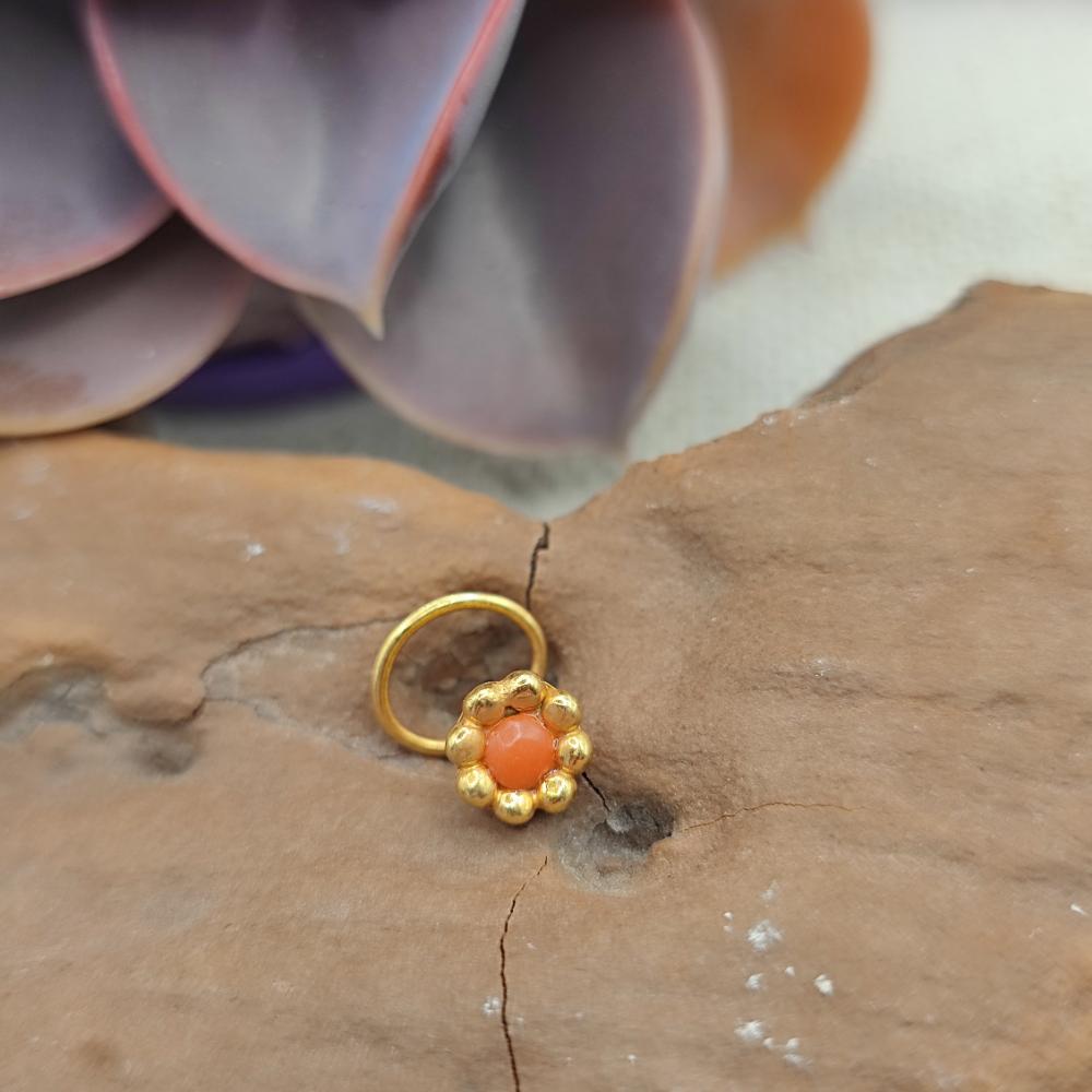 Gold-plated brass nose ring with turquoise - REVATI. Small details, big meanings. These gold-plated brass nose rings with a choice of stone encapsulate the charm of essential jewelry that tells a story. Their delicate shape, enriched with a small golden corolla, holds a luminous stone that you can choose according to your sensibility and your heart's symbol: turquoise, garnet, moonstone or carnelian.