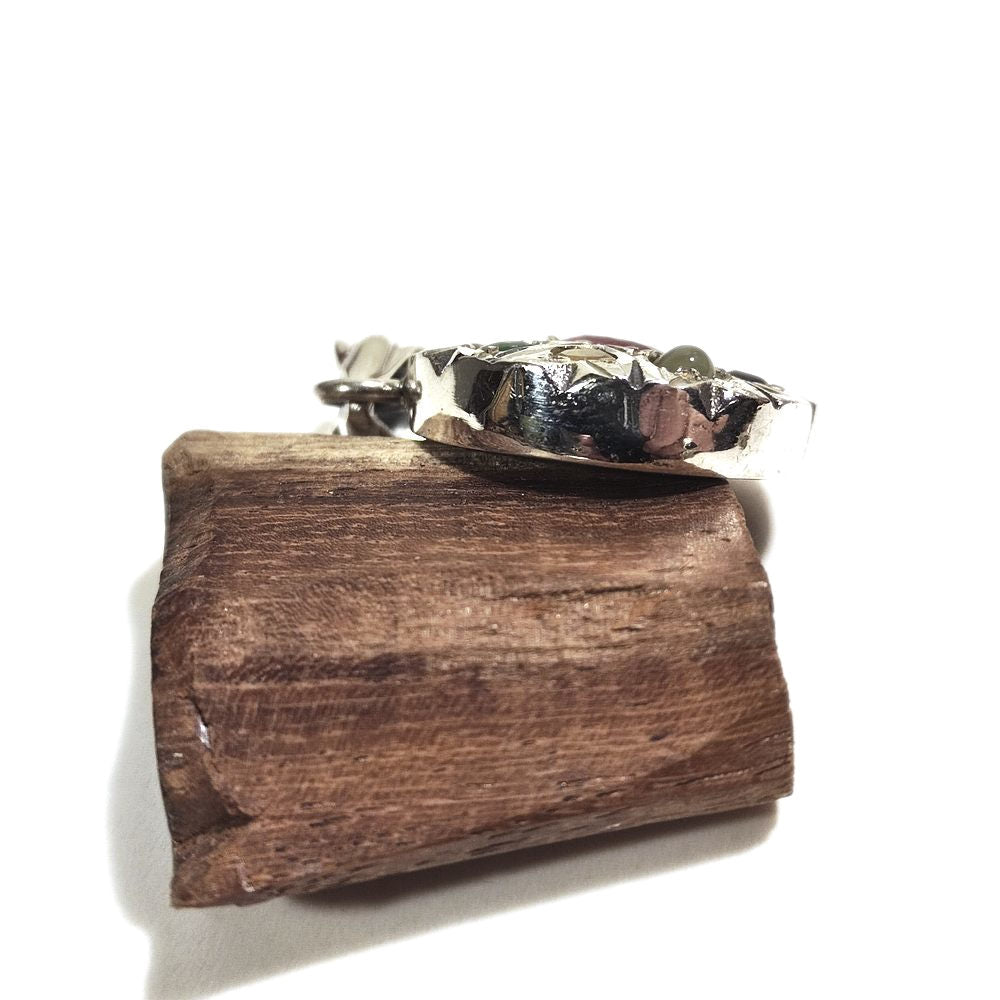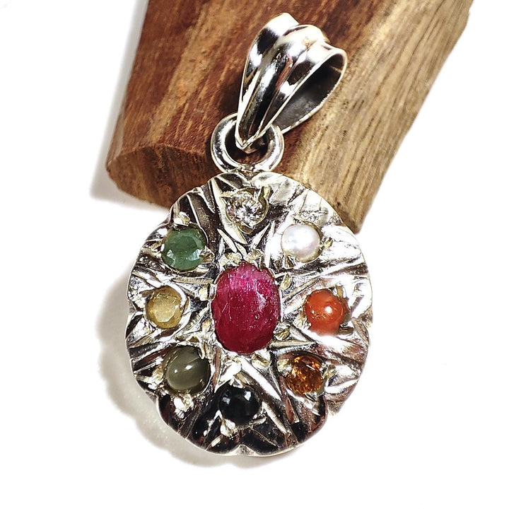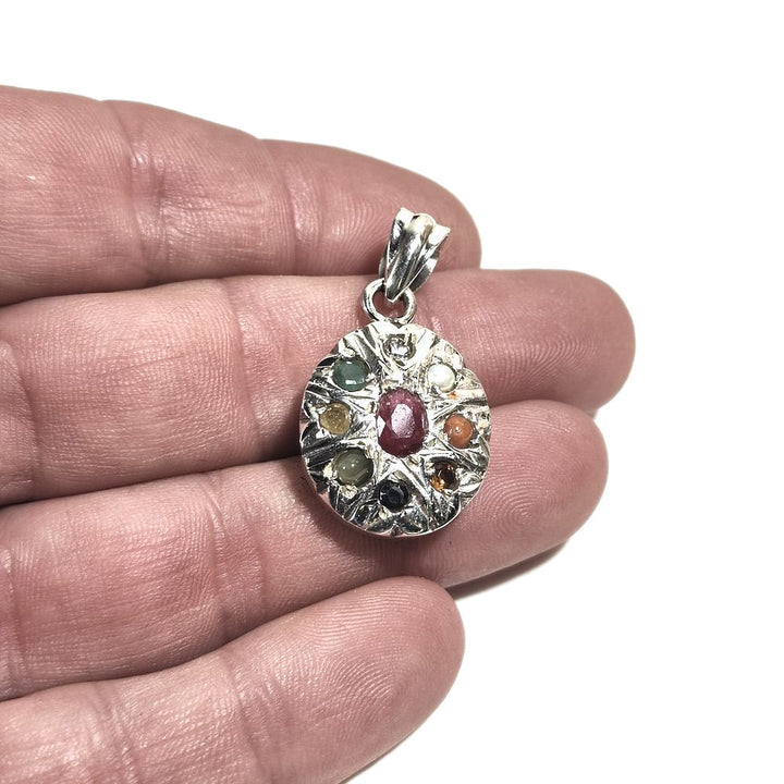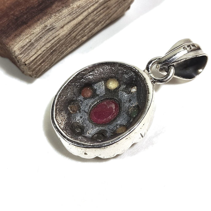 NAVRATAN pendant 925 silver - NAV. A pendant typical of the Hindu tradition which is made by hand-crafting a single piece of silver in which the stones are set. The artisans who have passed down the tradition for centuries still work with the tools historically used to make these pendants.