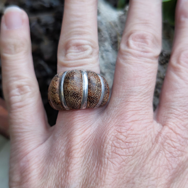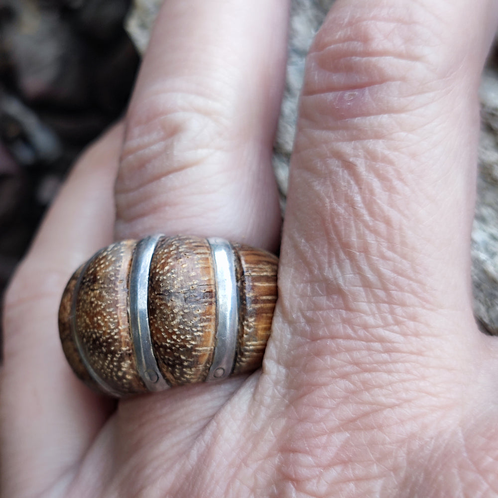 Ethnic ring in 925 silver and wood - SAWARDE. Ethnic ring in 925 silver finely made of wood and silver. The ring has a carved wooden base and also worked with linear silver inserts. An original ring that mixes materials, lines and colors with contrasts and harmonies.