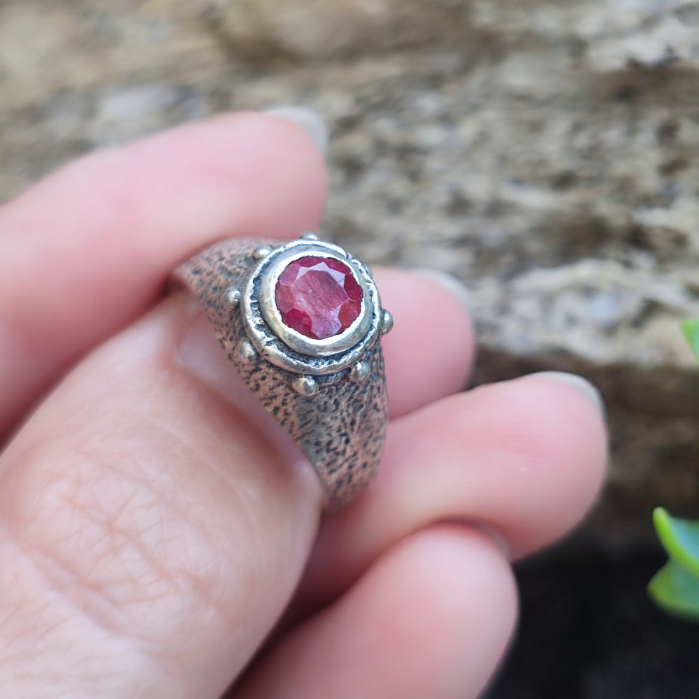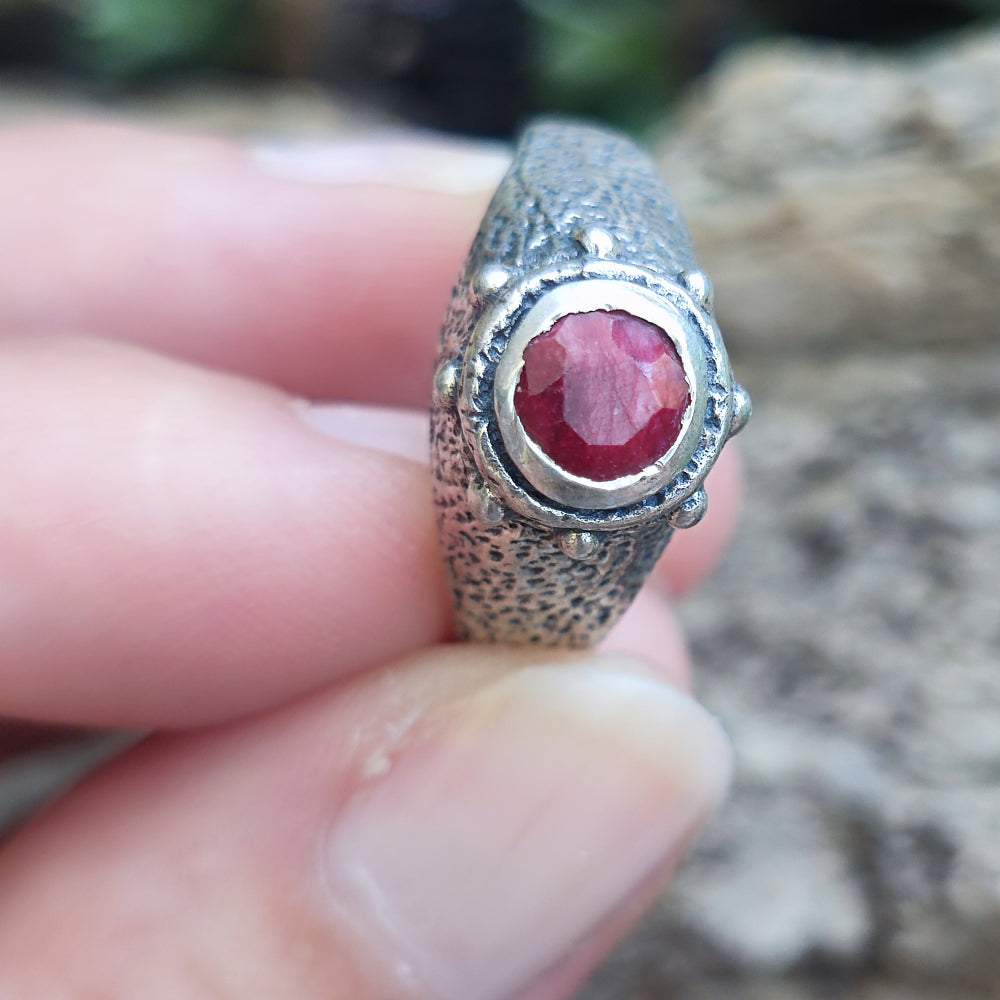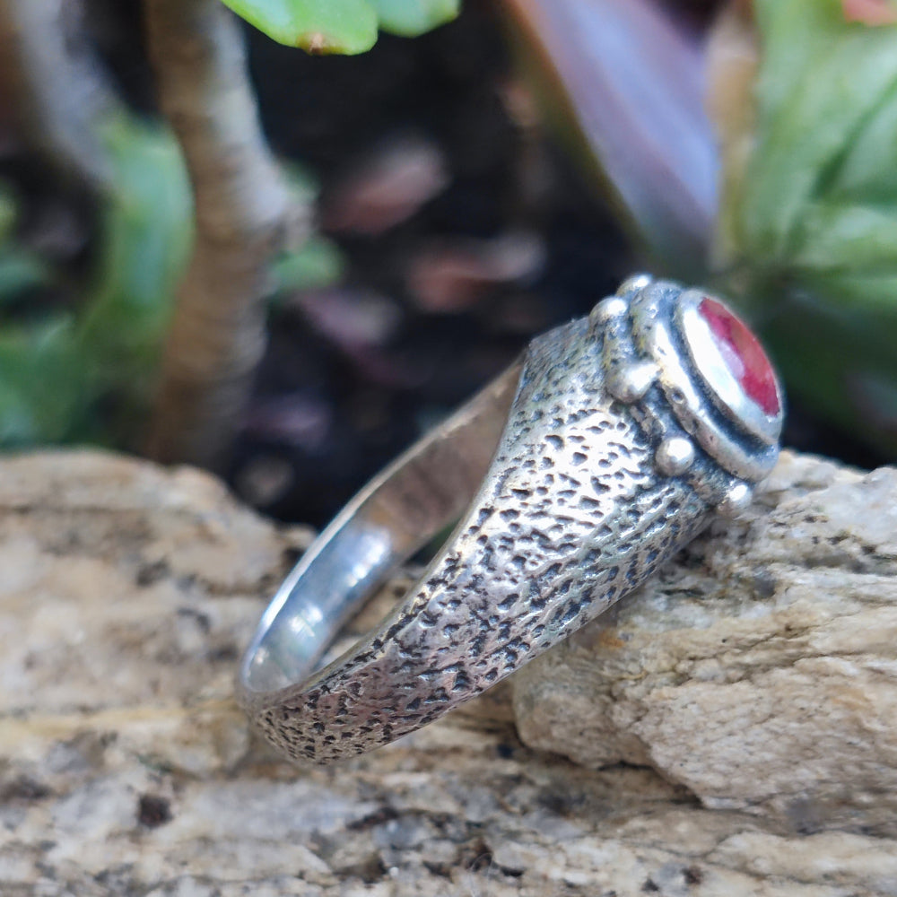 Ethnic ring with stone in 925 silver - MOTINPUR. Ethnic ring with a high band, finely handcrafted according to Indian tradition, with Ruby root . The workmanship of the band creates a pattern that gives movement and brightness.