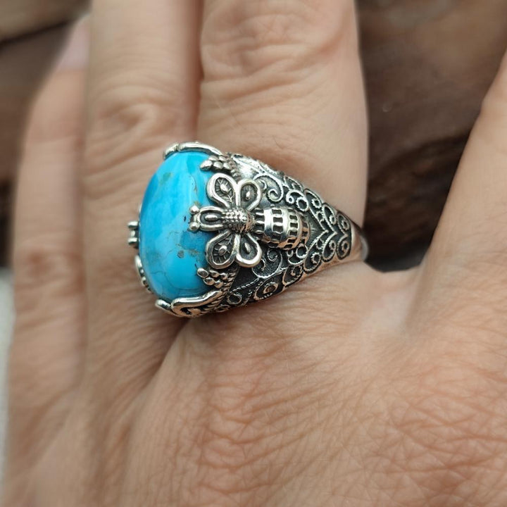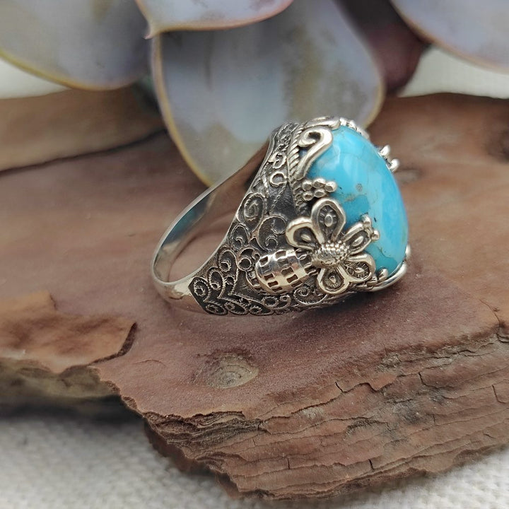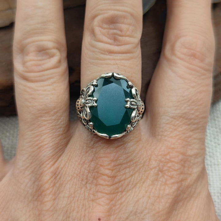 Anello etnico in argento 925 con pietra - KURMUN. Dai un tocco speciale al tuo look con il nostro anello a fascia alta in argento 925, un gioiello che unisce eleganza e natura. La sua lavorazione artigianale, arricchita da motivi naturali e dettagli floreali, crea un design unico che cattura subito l’attenzione.