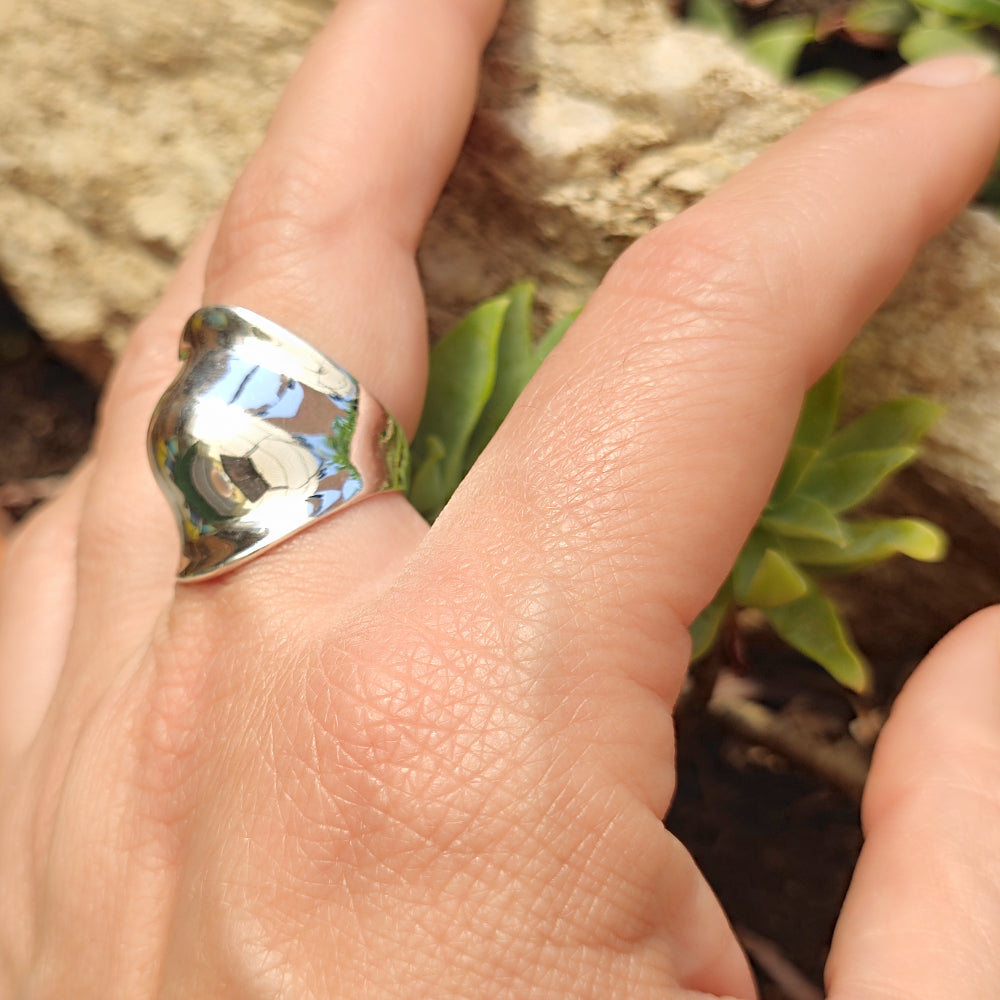The ring is in fact composed of a high, rounded band that wraps around the finger with a touch of luxury. The polished, finely crafted surface reflects the light, thus enhancing the purity and beauty of the silver. Every detail is taken care of to ensure a flawless finish, making this ring a true masterpiece of craftsmanship.