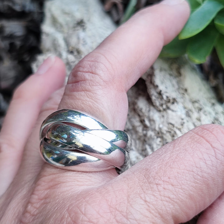 The ring, being made up of four rings, has a slightly variable size because it depends on how the four rings come together and make up when they are slipped onto the finger.