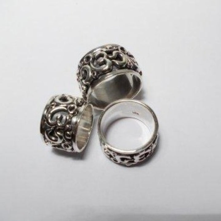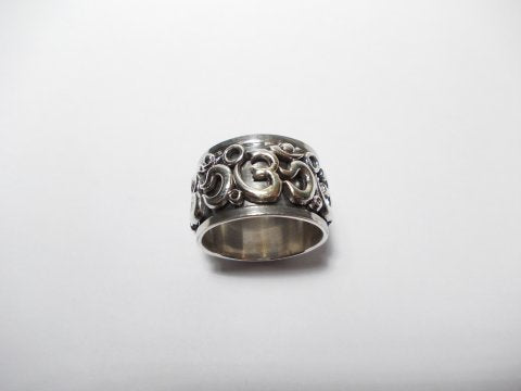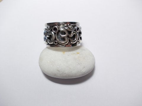 OM anti-stress band ring in silver - AJMER. Wide band ring in silver with OM depicted. This ring is made up of two bands that rotate on top of each other. The lower band is smooth while the upper one is perforated with an OM (AUM) motif