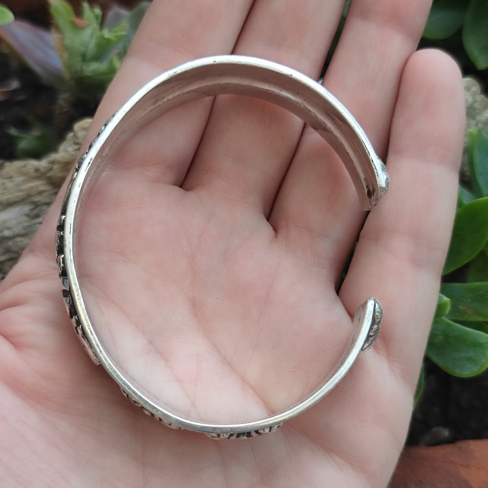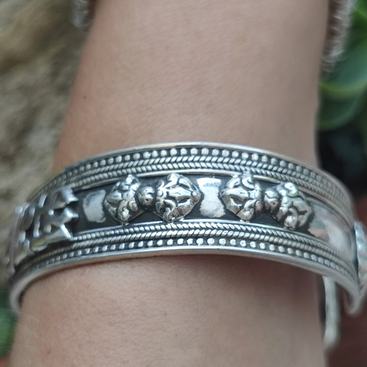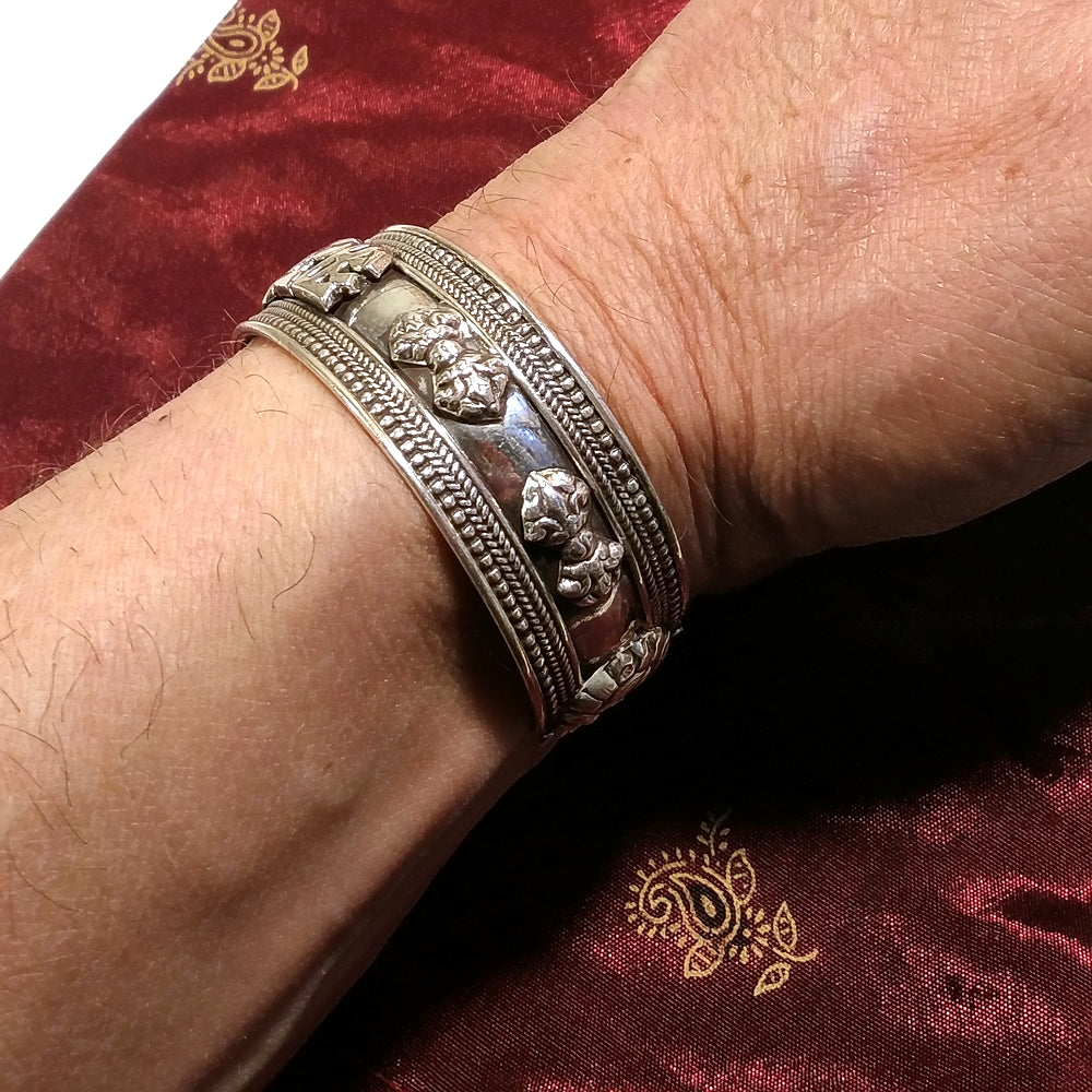 OM MANI PADME HUM bracelet in 925 silver - SIDDHARTHA. This is a rigid ethnic bracelet in burnished silver handcrafted and depicts the mantra OM or the mantra of compassion. An open bracelet ideal for men and women.