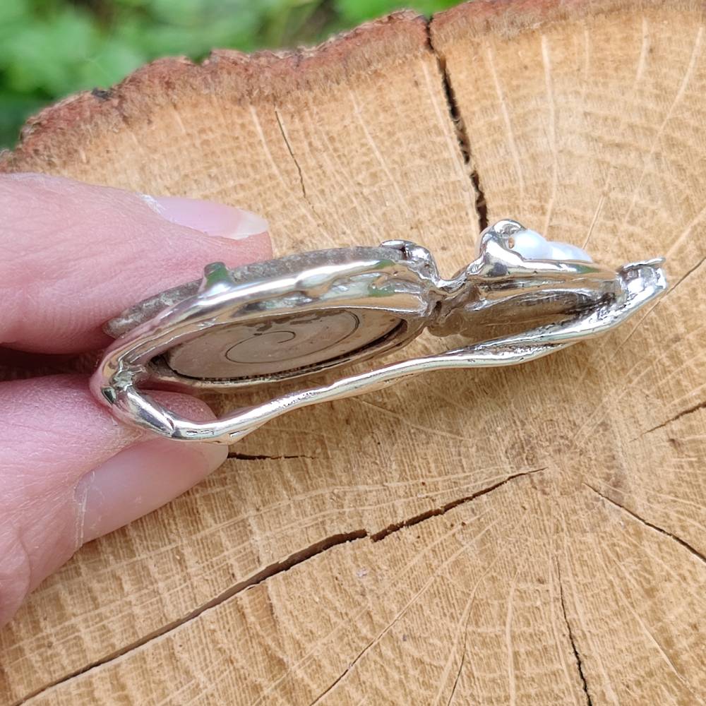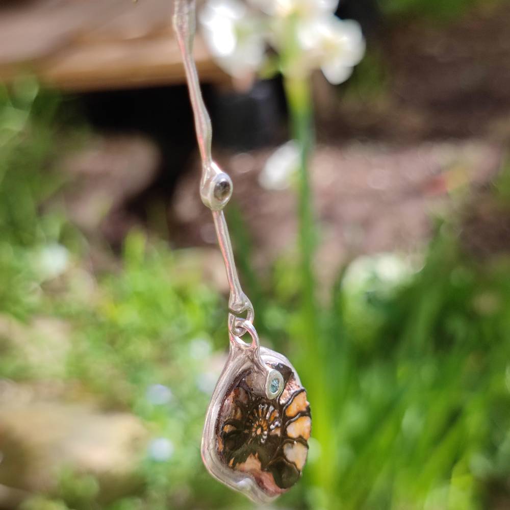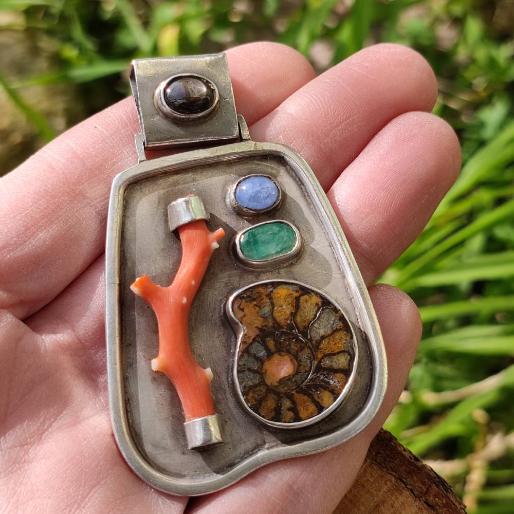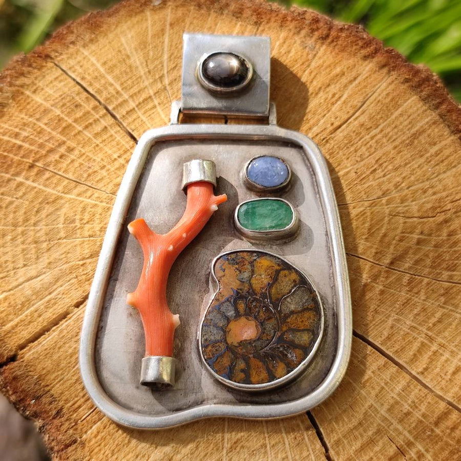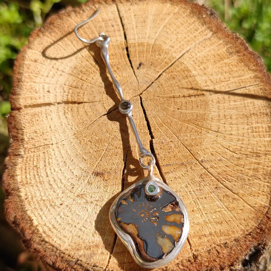 925 silver ring with fossil ammonite and emerald. The ring is a unique piece, made entirely by hand.