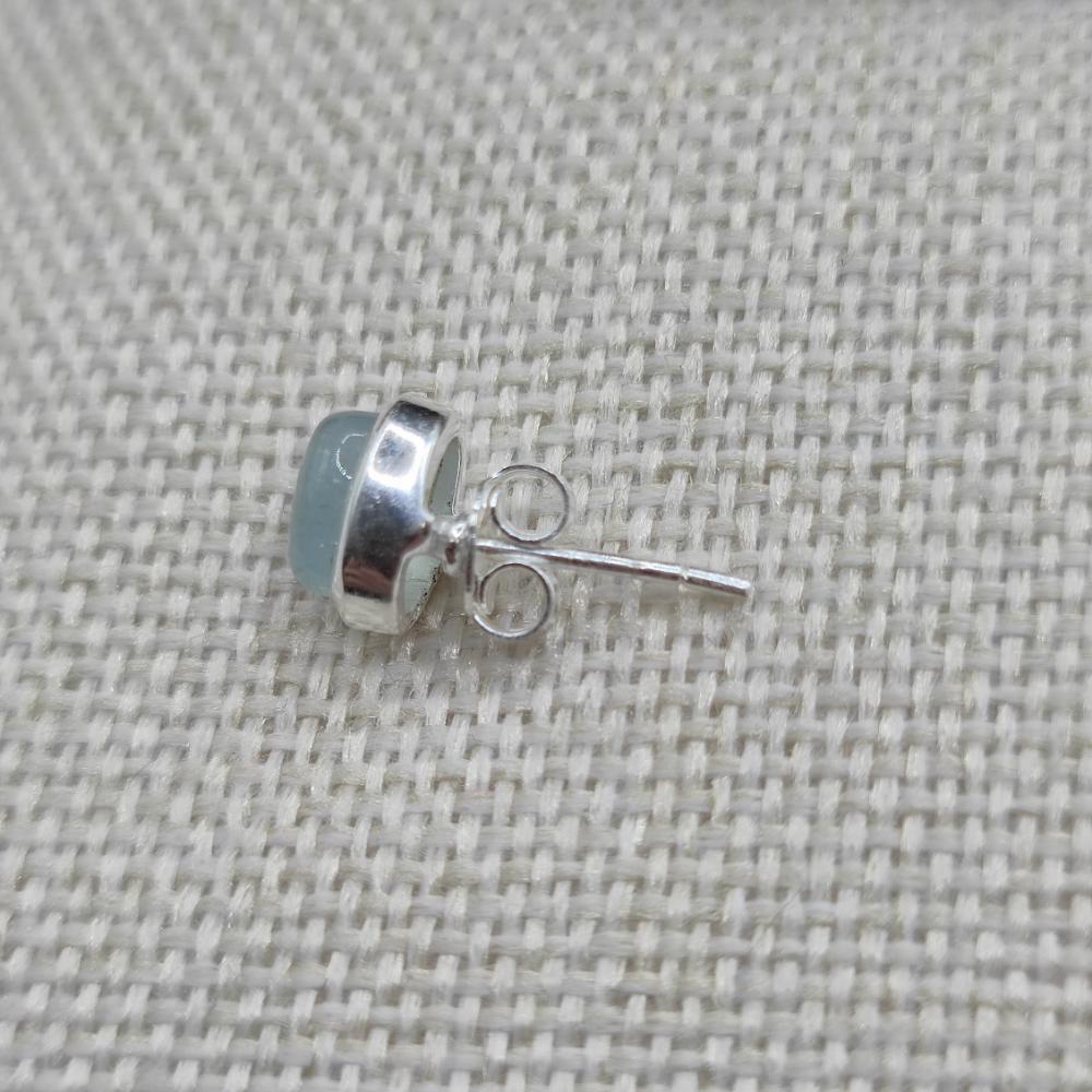 Oval silver earrings with aquamarine - VARSHA . Discover the discreet charm of these 925 silver oval stud earrings with natural aquamarine : a simple yet luminous piece, designed for those who love refined details and easy-to-wear aesthetics. The stone, in a soft oval cabochon, offers aquamarine reflections that recall the sea and naturally illuminate the face.