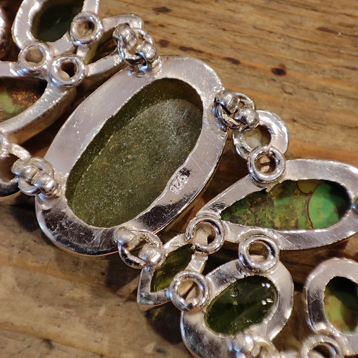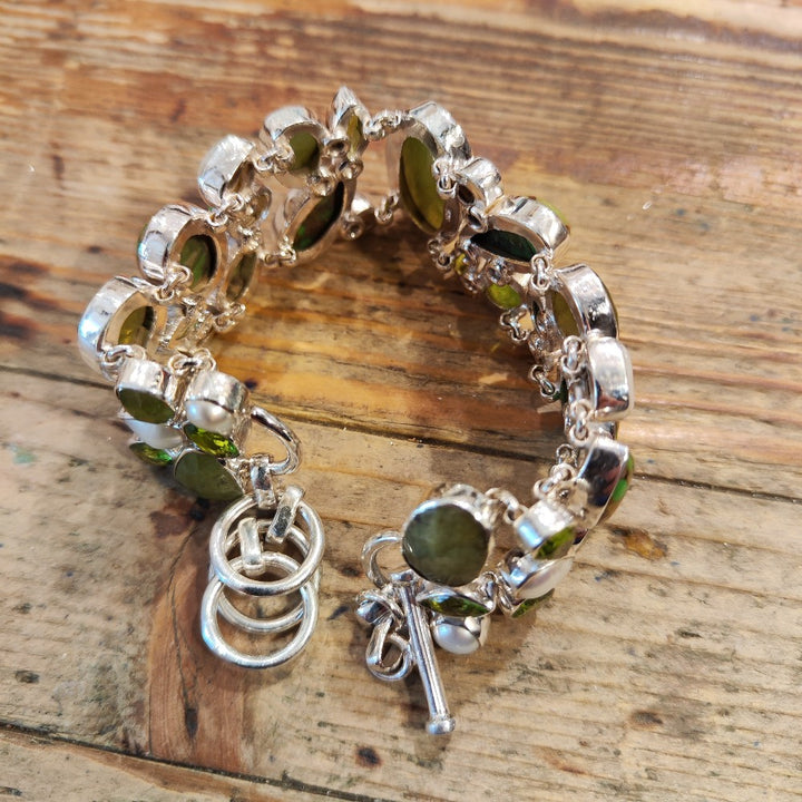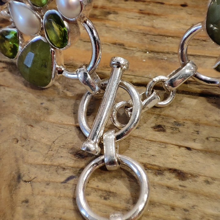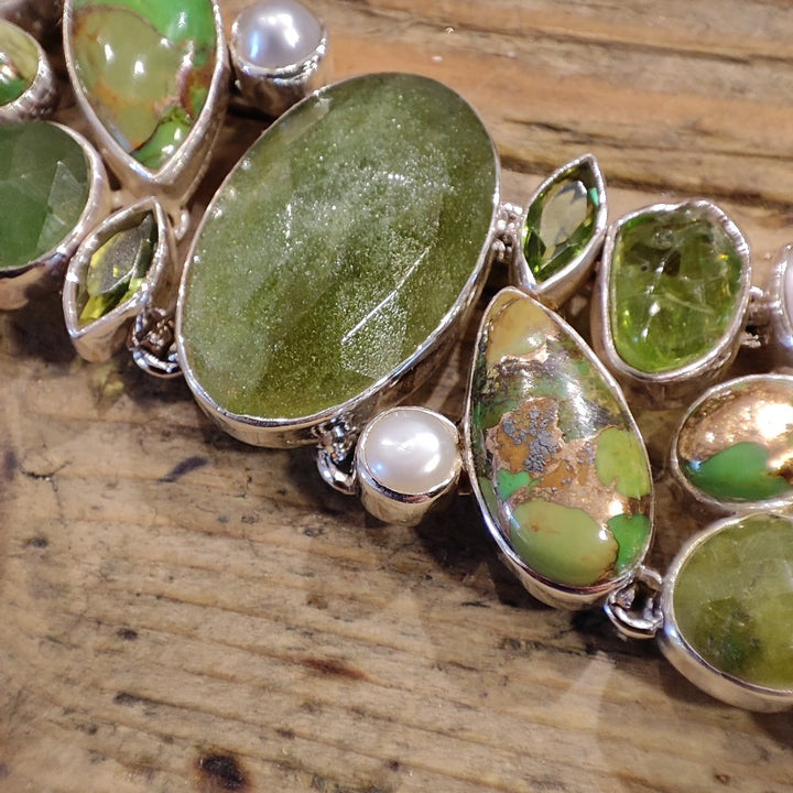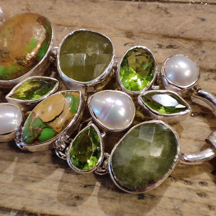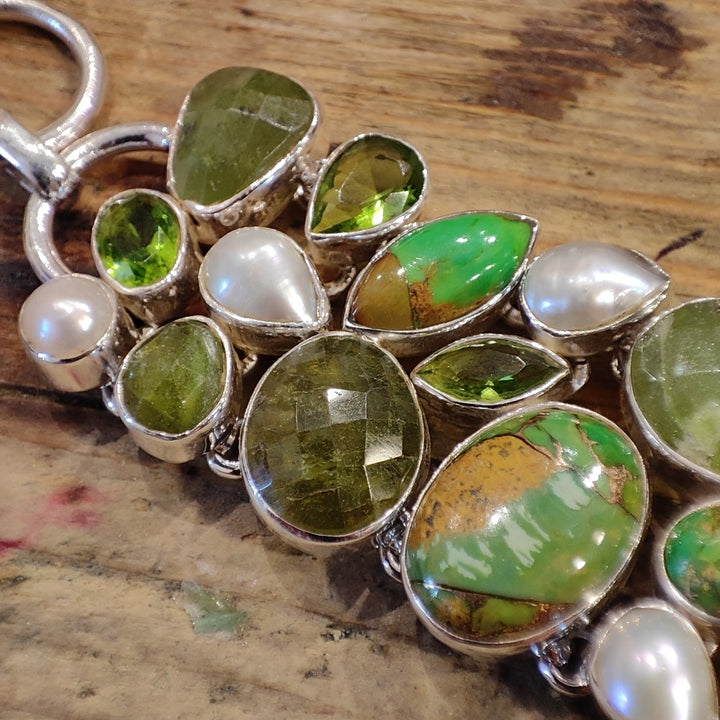 - Stone(s): Prehnite, Cultured Pearl, Green Turquoise, Raw Olivine, Peridot