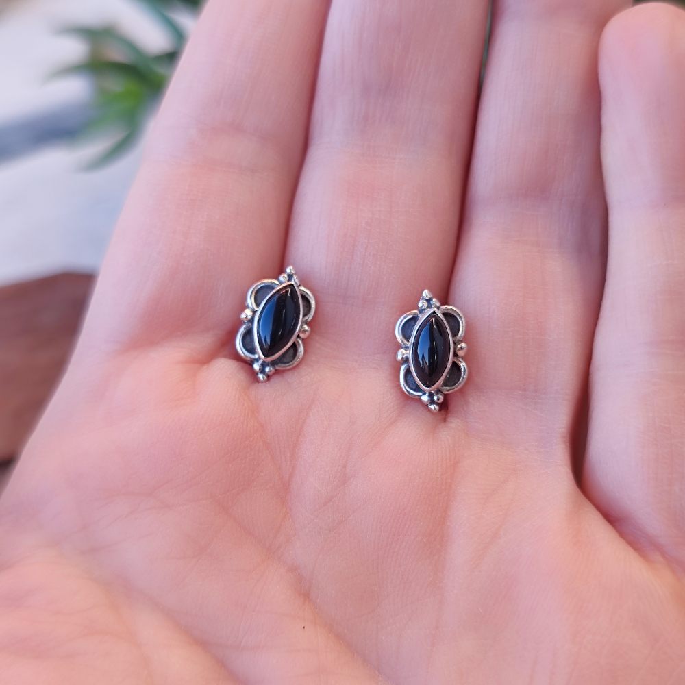 Ethnic EARRINGS with stone in 925 silver - BAKAULI. Ethnic Indian jewelry with stone worked in silver. Very bright lobe earrings with black Onyx stone and have an elongated shape with a contrasting decorated edge between shiny and burnished silver.