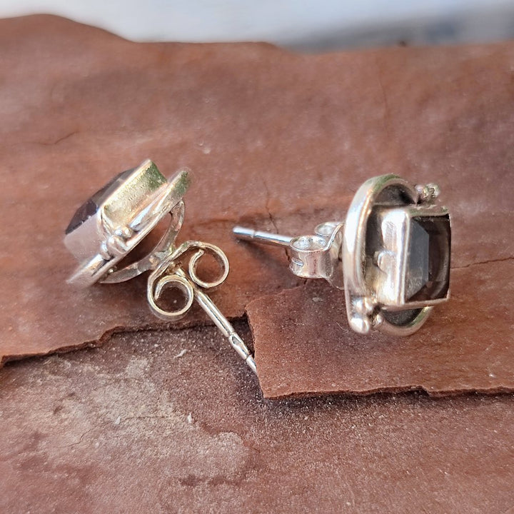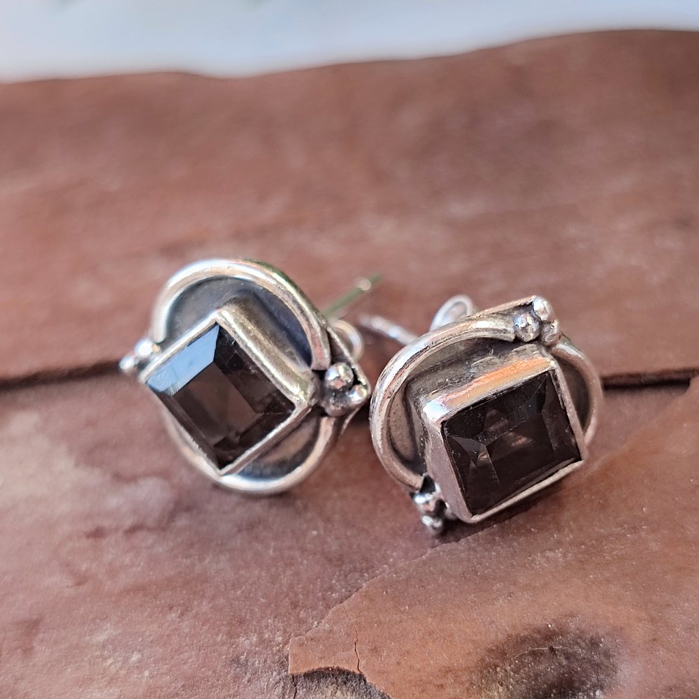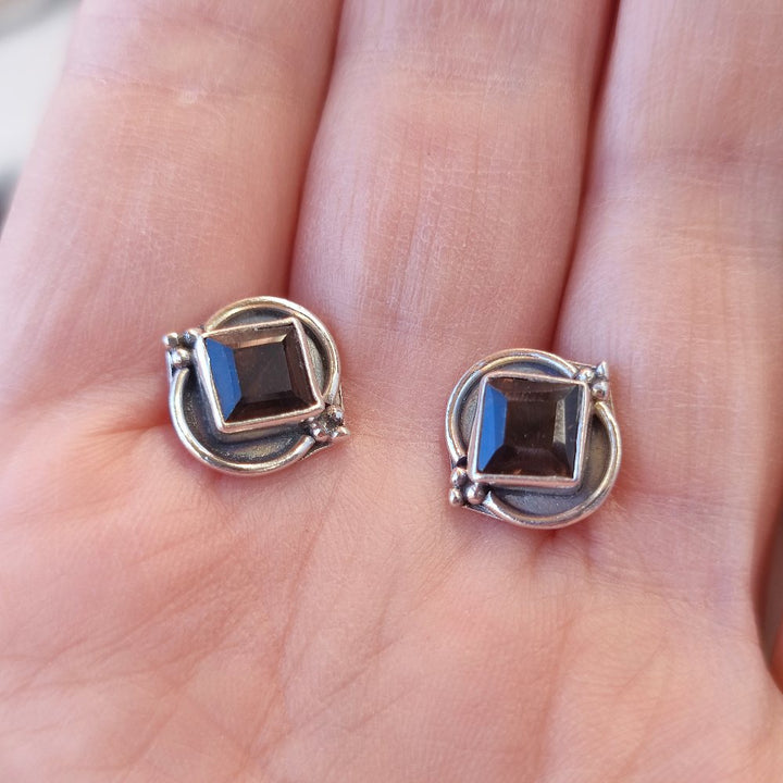 Ethnic EARRINGS with stone in 925 silver - POKSARI. Ethnic Indian jewelry with stone worked in silver. Very bright lobe earrings with smoky quartz stone. The earrings have a shiny surface and are very bright. They have a rhomboid shape and are decorated with a contrast between shiny and burnished silver.