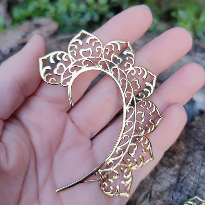 Elven Brass Earring - AVARIN. An Indian brass jewelry with a lightweight construction that ensures a comfortable experience of a handcrafted jewelry. The elven earrings are sold individually and are ideal for men and women. They are finely decorated with elements that recall nature.