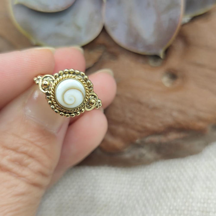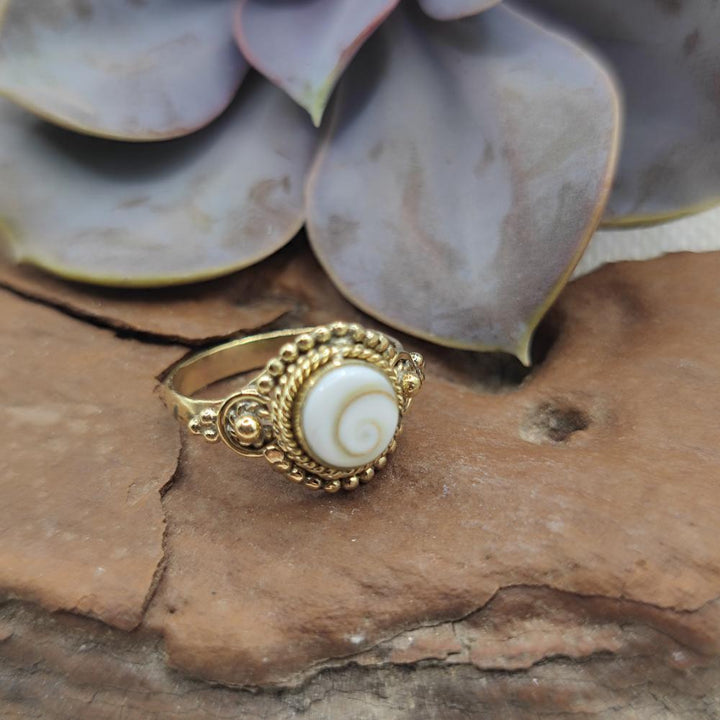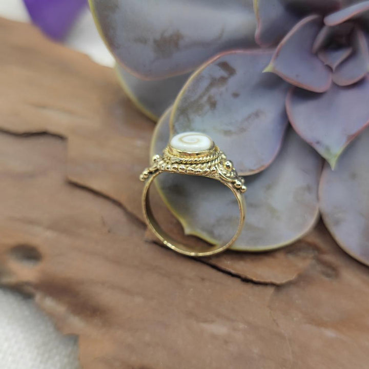 Ethnic brass ring with stone - DUBRA. Discover a handcrafted brass piece with a polished gold-tone finish. Its unique and sophisticated, yet simple and refined, shape makes it perfect for any occasion. A small, dazzling detail designed just for you! The ring features a faceted or cabochon-set stone.