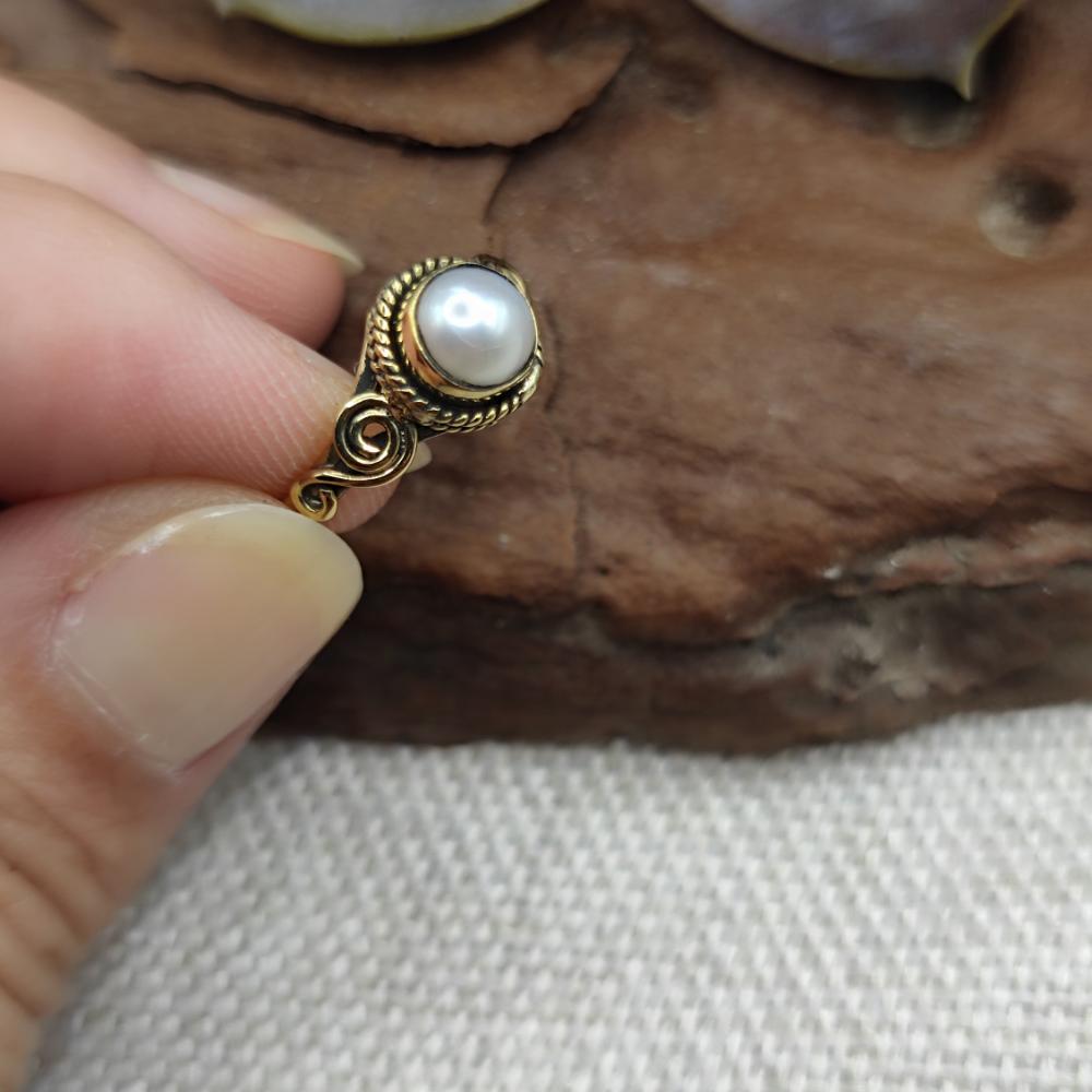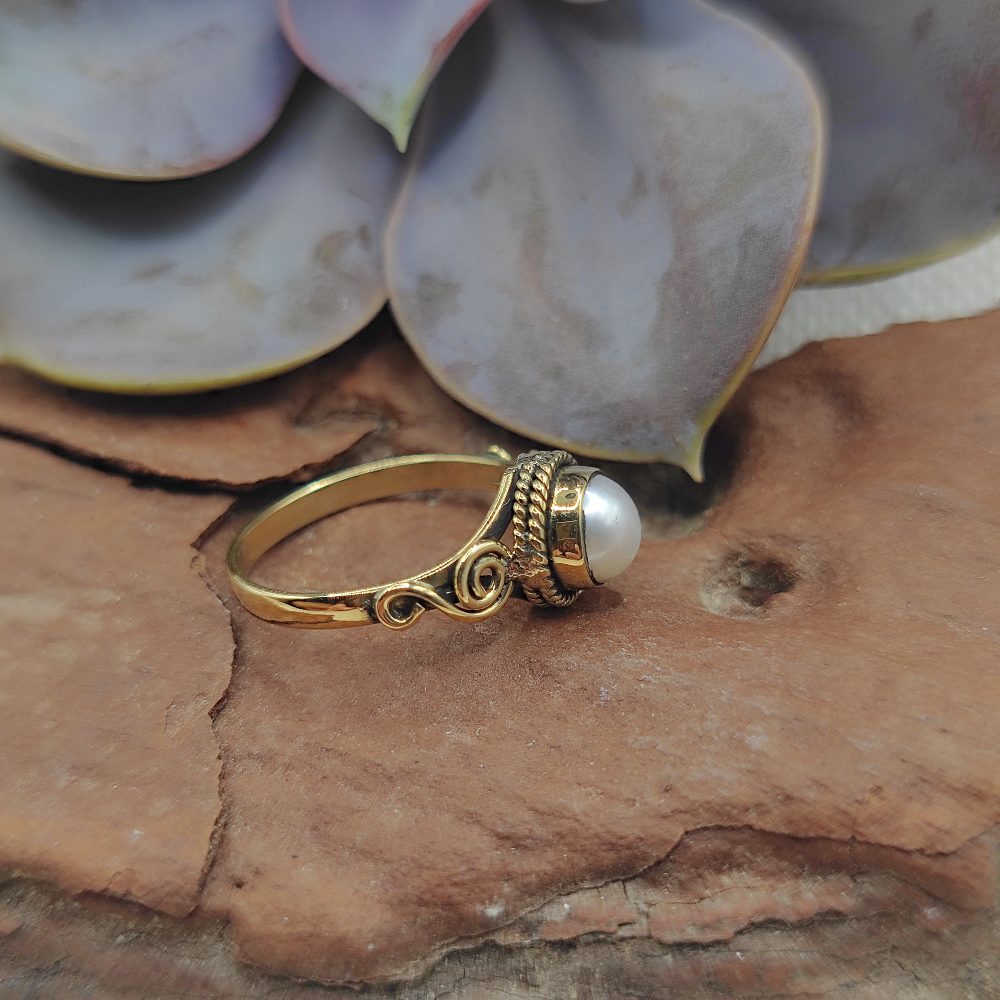 Ethnic brass ring with stone - KATRAS. Discover a handcrafted brass piece with a polished gold-tone finish. Its unique and sophisticated, yet simple and refined, shape makes it perfect for any occasion. A small, dazzling detail designed just for you! The ring features a faceted or cabochon-set stone.