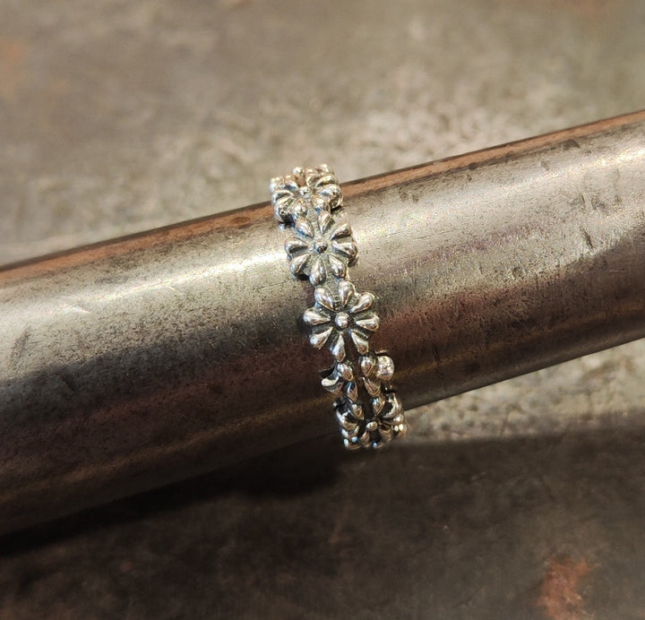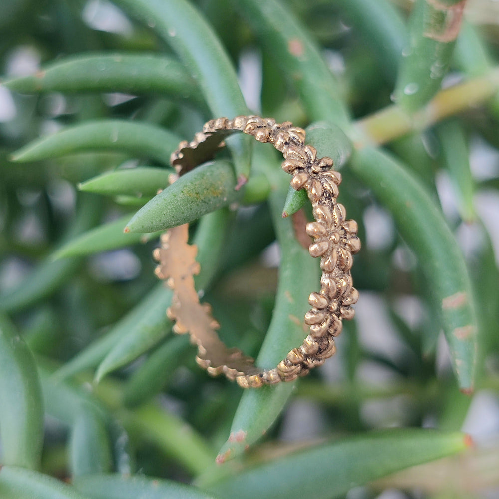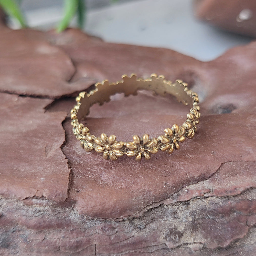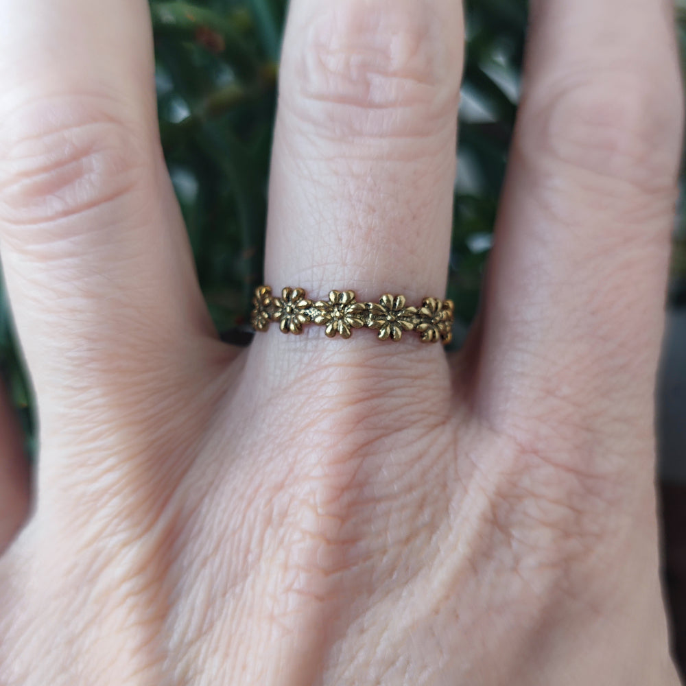 Handcrafted brass RING with flowers - GANGNER. An Indian jewelry in brass or 925 silver with a lightweight construction that ensures a comfortable experience of a handmade jewelry. Thin band ring with small flowers finely crafted and joined to create a wraparound pattern.