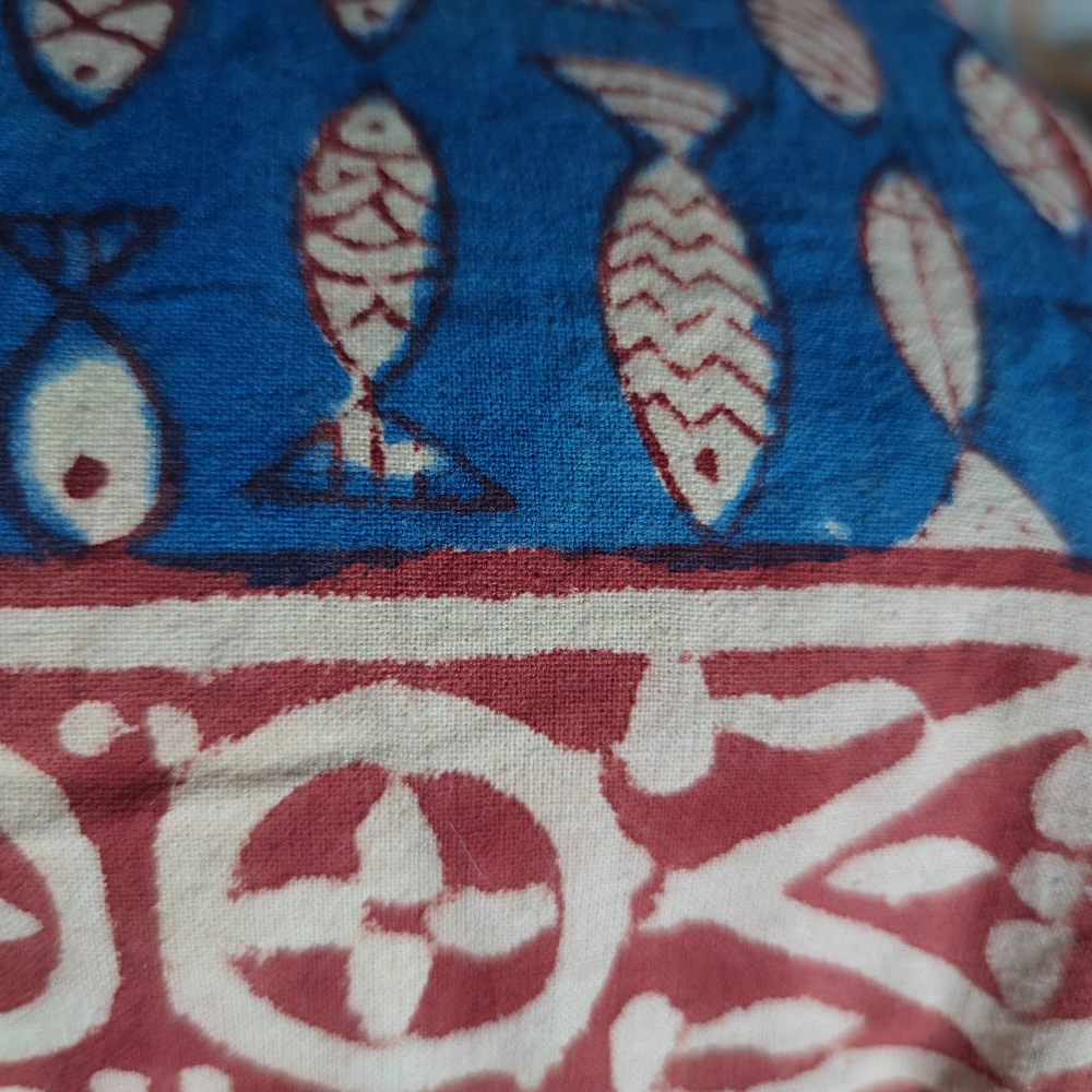 The stamping of the patterns and the production of the wooden stamp are entirely done by hand. Furthermore, for multicolored designs, the printing process is repeated once for each color. This means that for a three-color design, the entire fabric is printed three times.