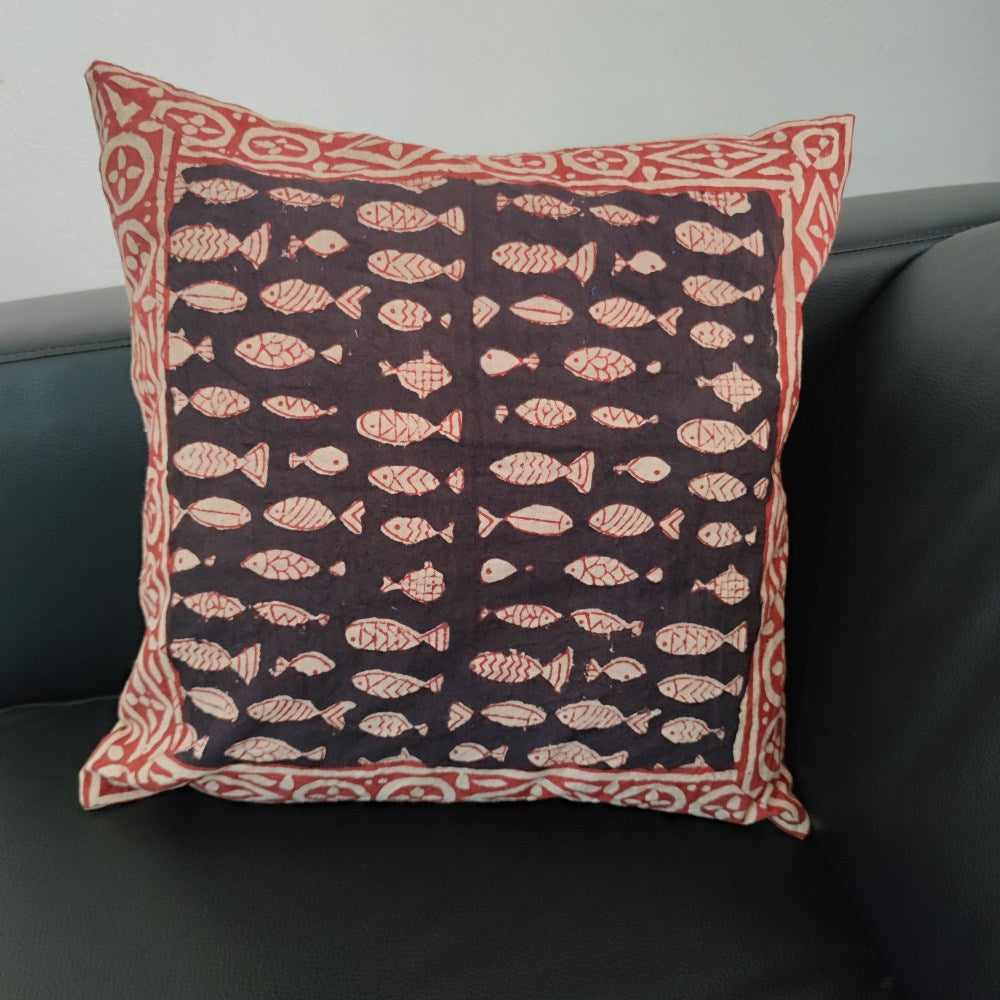 Handcrafted 100% cotton ethnic pillow cover - KUMUN with tribal patterns. The designs decorating the pillow cover are created with handcrafted wooden stamps. A typical and traditional Indian technique for a colorful ethnic pillow cover.
