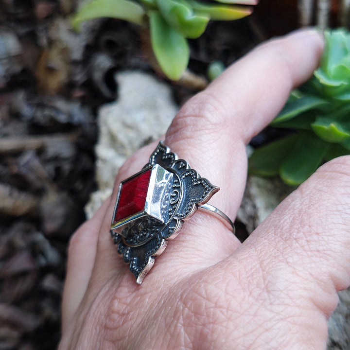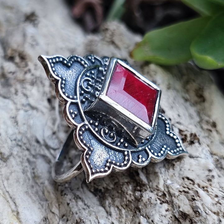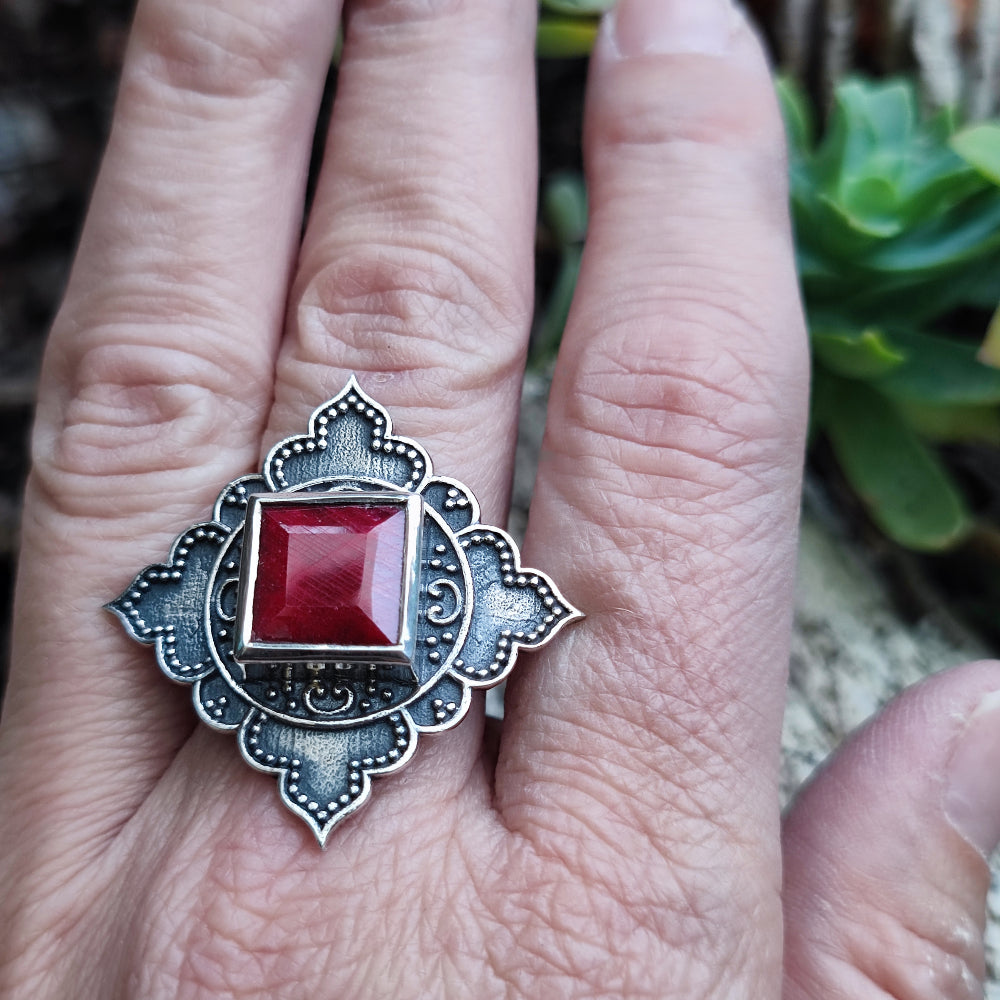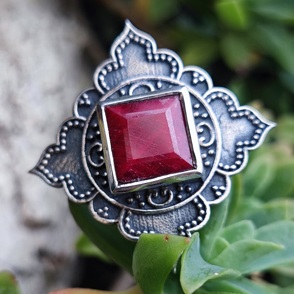 Ethnic ring with stone in 925 silver - EKDORI. Ethnic ring worked according to the Indian tradition with partially burnished 925 silver stone. The ring is handcrafted and available with Ruby Root .