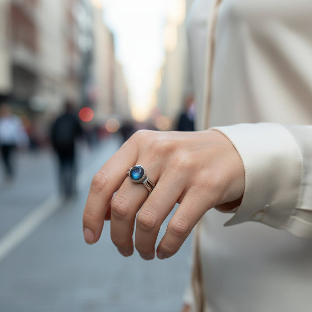 Labradorite , with its iridescent colors ranging from blue to green, is known as the "stone of magic" because it brings light and character to those who wear it. Paired with durable and brilliant sterling silver, it creates an elegant and contemporary contrast. The decorated band enhances the design, adding refined details that make the ring perfect for those who love to stand out with class.