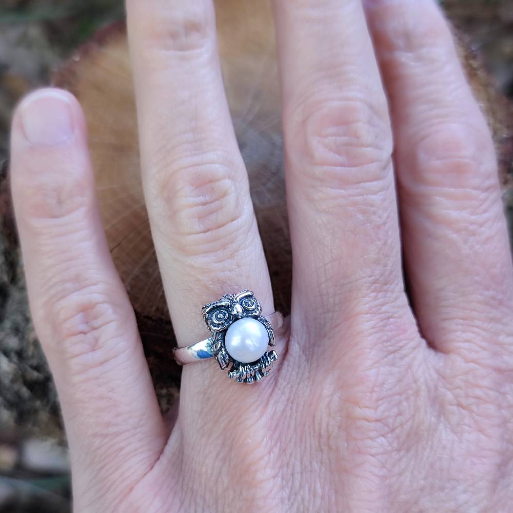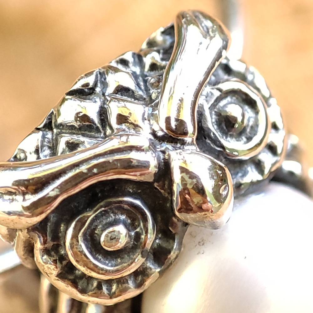 Ring with stone in 925 silver - RENGALI. An owl shaped pearl ring. This craftsmanship is also typical of North Indian jewellery. In fact, as ornamental elements, made one by one by hand, not only dots, petals, floral motifs are used, but also depictions of peacocks, elephants, tigers and snakes.
