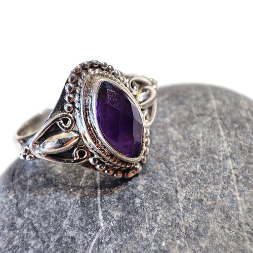 Ring handcrafted in 925 silver. Its surface is partially burnished. The faceted semi-precious stones are set one by one by hand. Ethnic design with faceted stone.