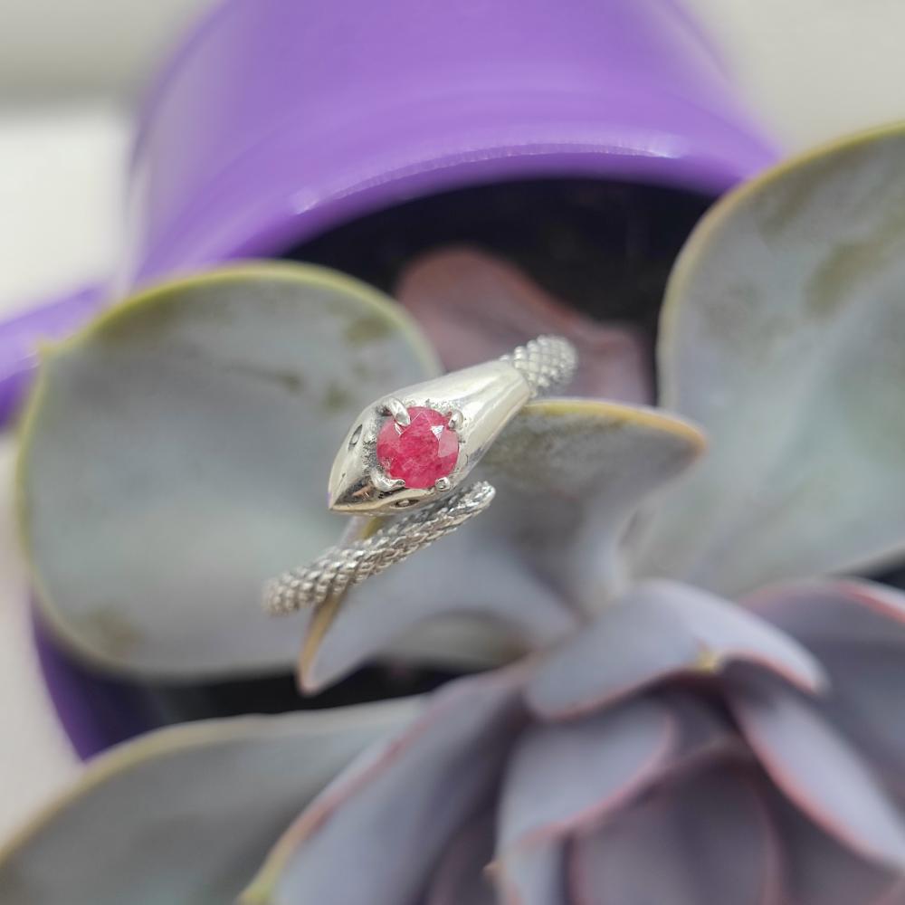 The snake , a symbol of rebirth, protection, and transformation, wraps around the finger in an elegant and decisive design. The choice of stone adds a unique touch: