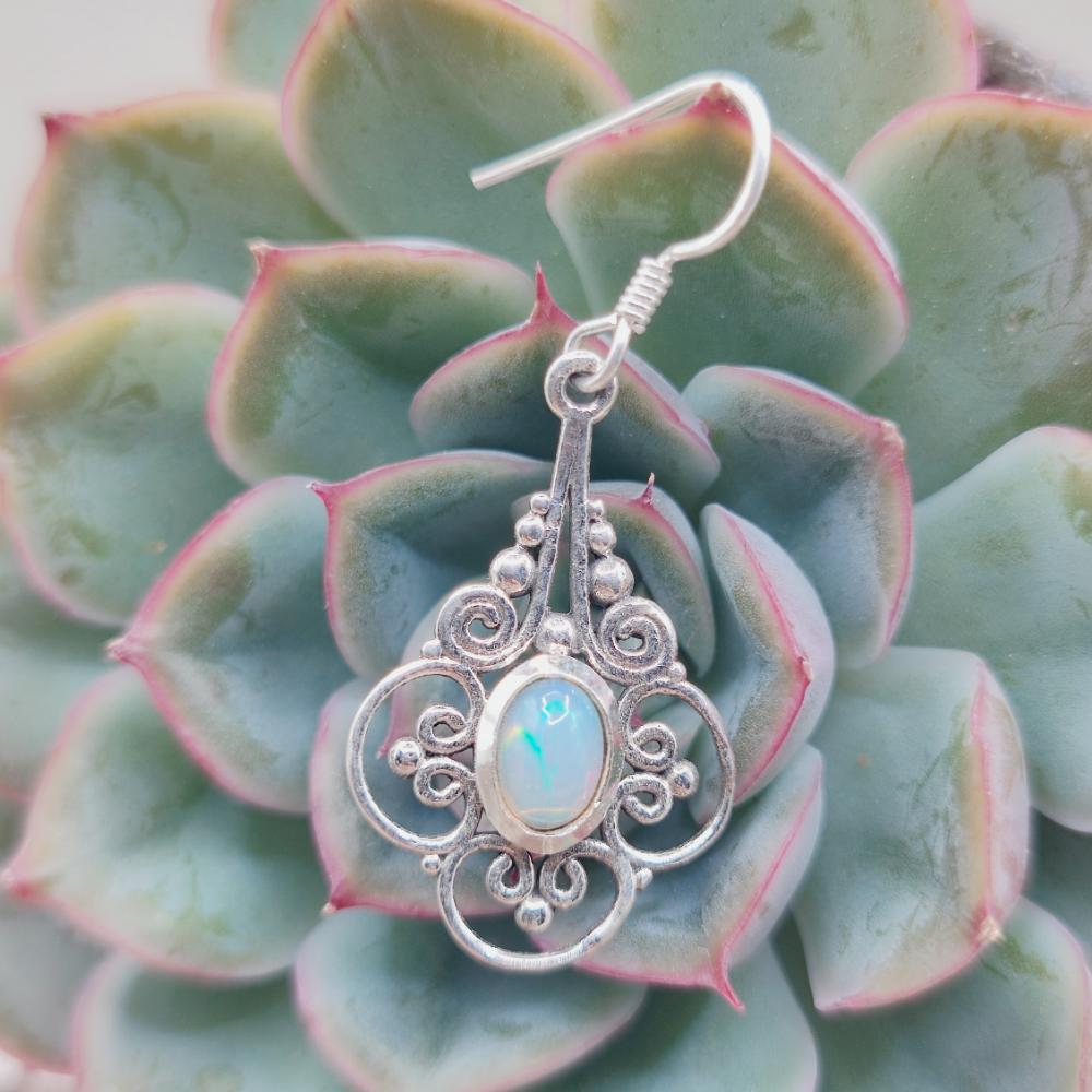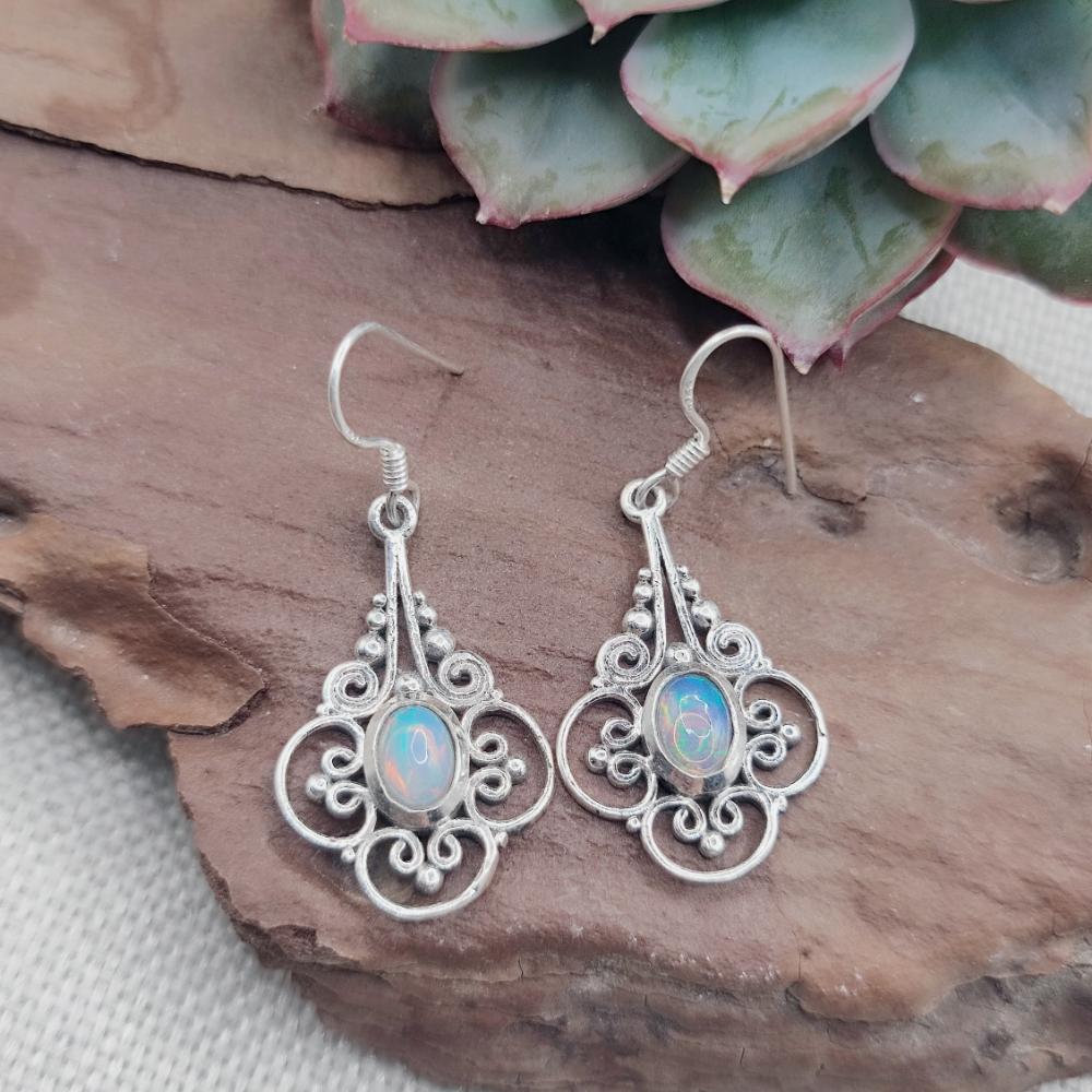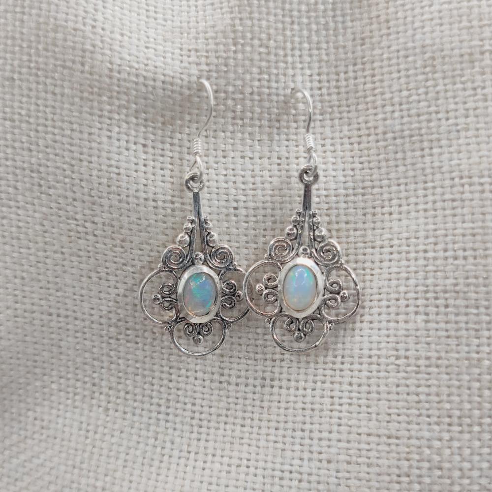925 silver moonstone earrings - VEDA . Delicate yet dramatic, these ethnic moonstone earrings in 925 silver exude timeless elegance. The intricate setting, inspired by traditional filigree, creates a harmonious design of swirls and microspheres framing an oval moonstone. The gem, known for its adularescence (the typical milky sheen with blue shimmers), changes light with every movement, giving the face a luminous and refined effect.