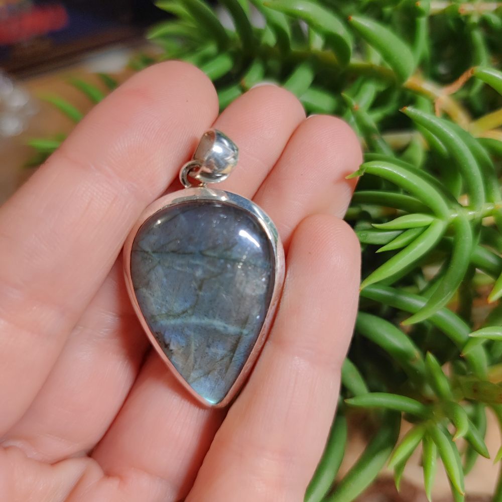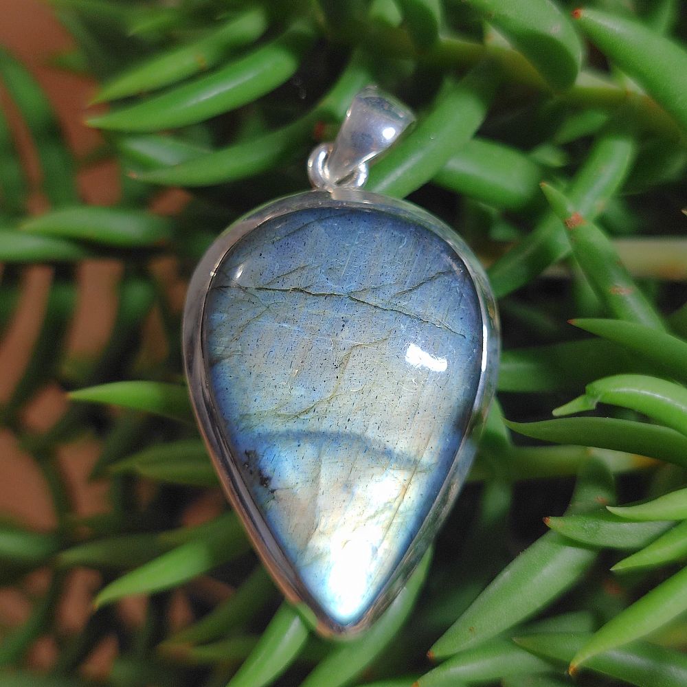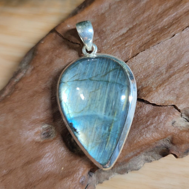 Ethnic pendant in 925 silver with stone - SABANG. A drop-shaped pendant with a polished surface and a Labradorite stone set.