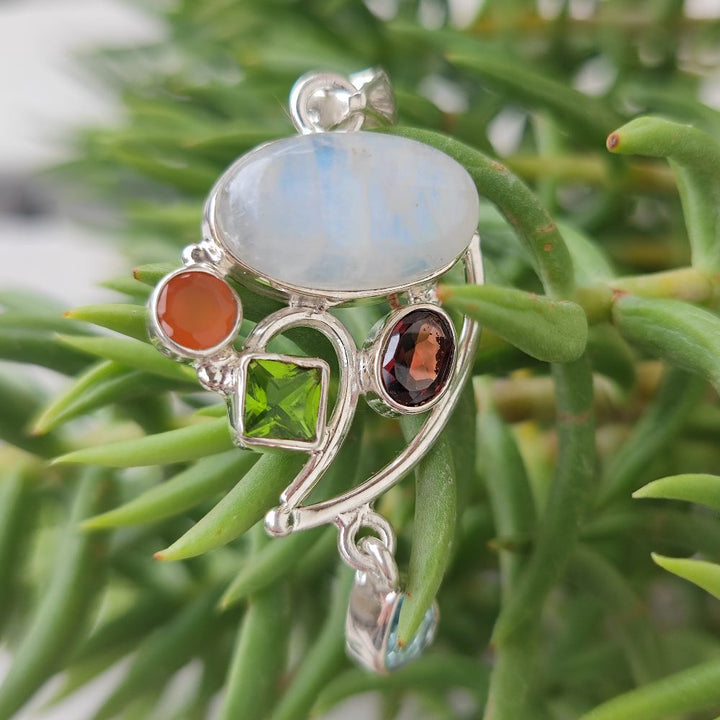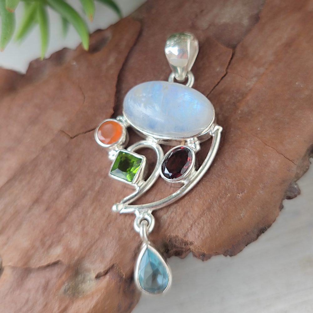 • Stone(s): Moonstone, Garnet, Perodot, Blue Topaz