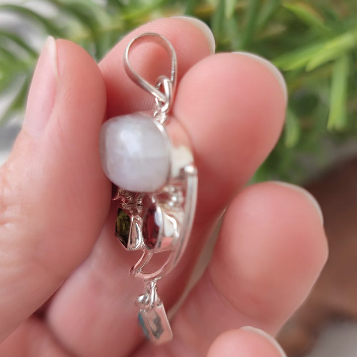 Ethnic pendant in 925 silver with stone - TUDIGAIA. Its surface is polished and the stones set are moonstone , blue topaz, peridot , garnet.