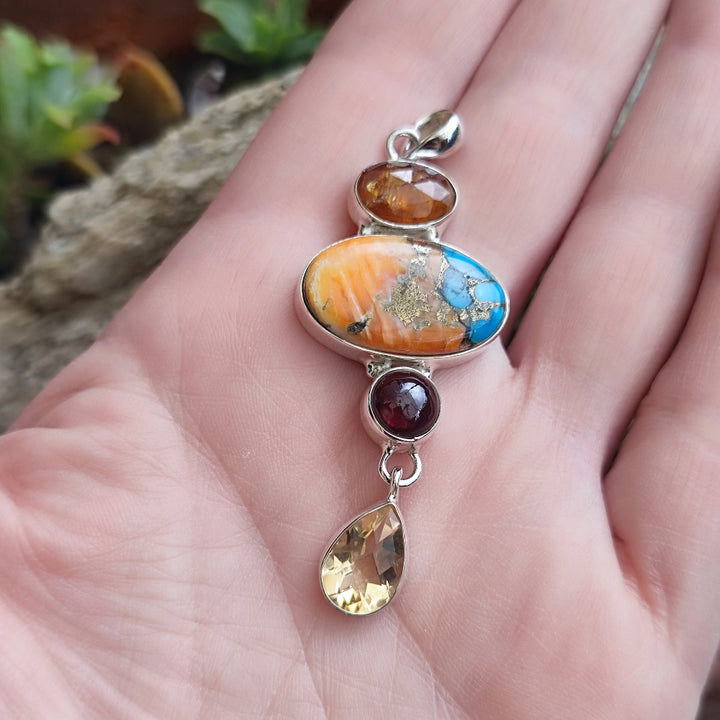 925 silver pendant with stone - HANDIA. Its surface is shiny and is set with a coppery Turquoise stone accompanied by Garnet , Citrine Quartz and Carnelian .
