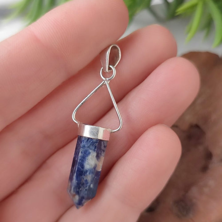 925 Silver Pendant with Stone - MOYNA. Its surface is polished and the stone that makes up the pendant is Sodalite . The pendant is a hanging prism and is very bright when worn.